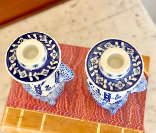 Vintage Blue and White Monkey Candlesticks (Set of 2)
