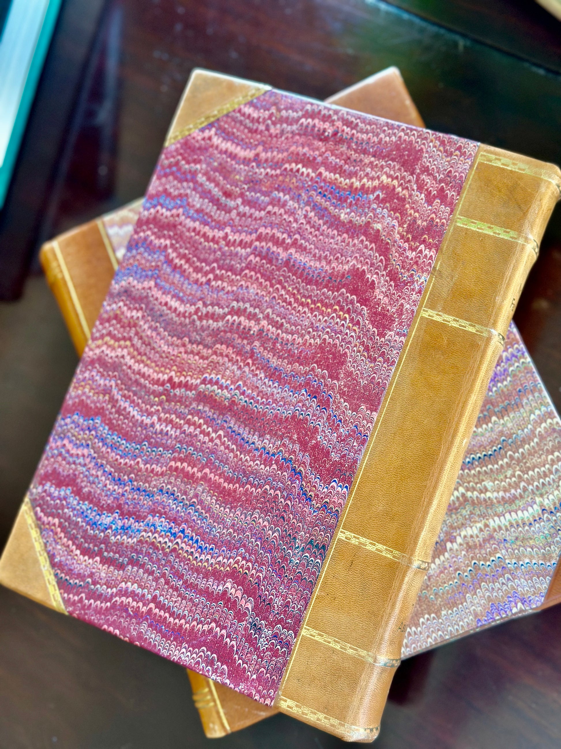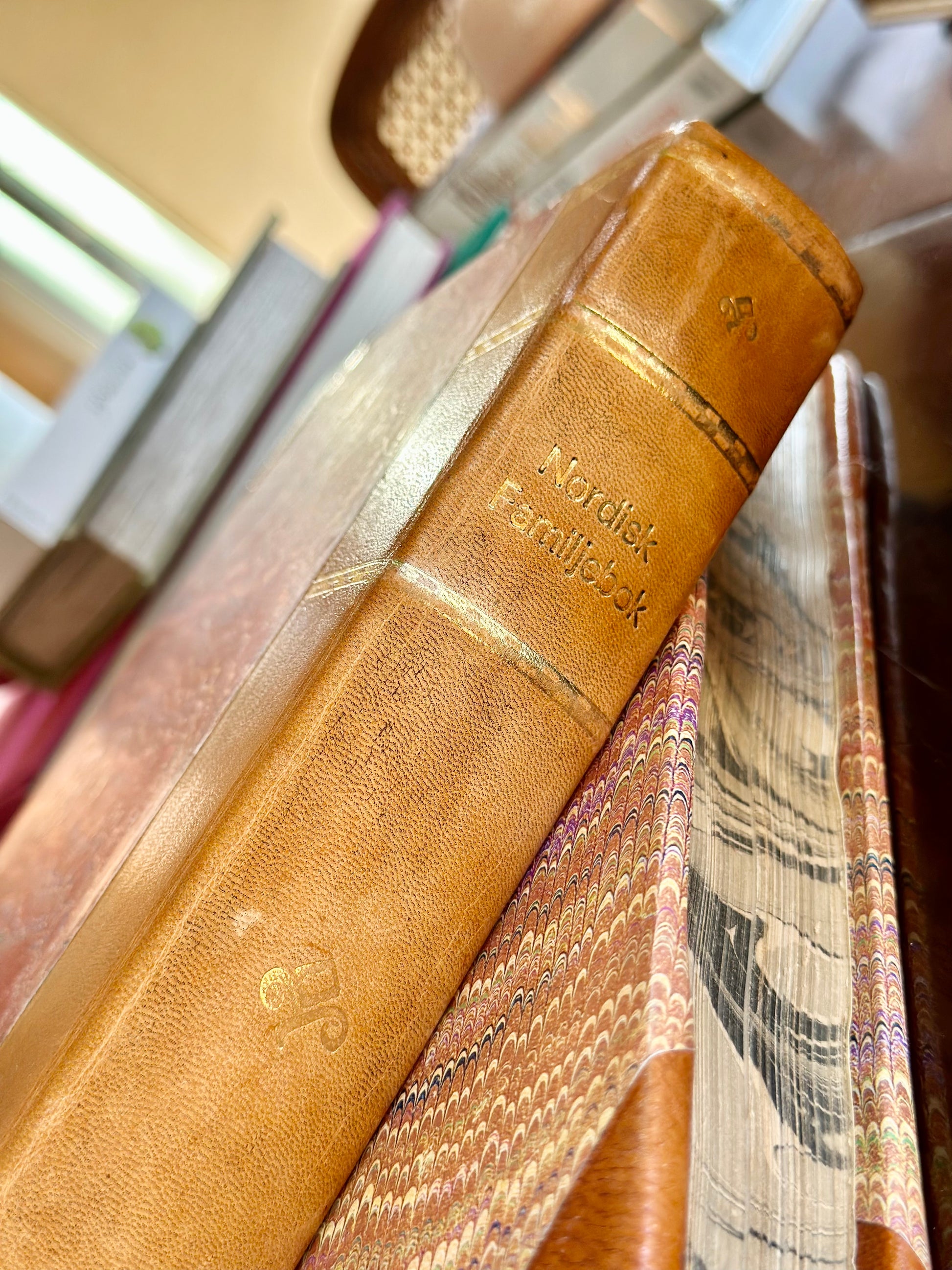 Nothing gives a cozier vibe to a room than leather bound books. The fact that these two are written in Danish and Norwegian is beside the point ok? They are just exquisite and the leather binding is BUTTERY. They have clearly been so well cared for. These two are not made for the bookshelf - oh no - they need to be able to show off their pretty marbled covers.