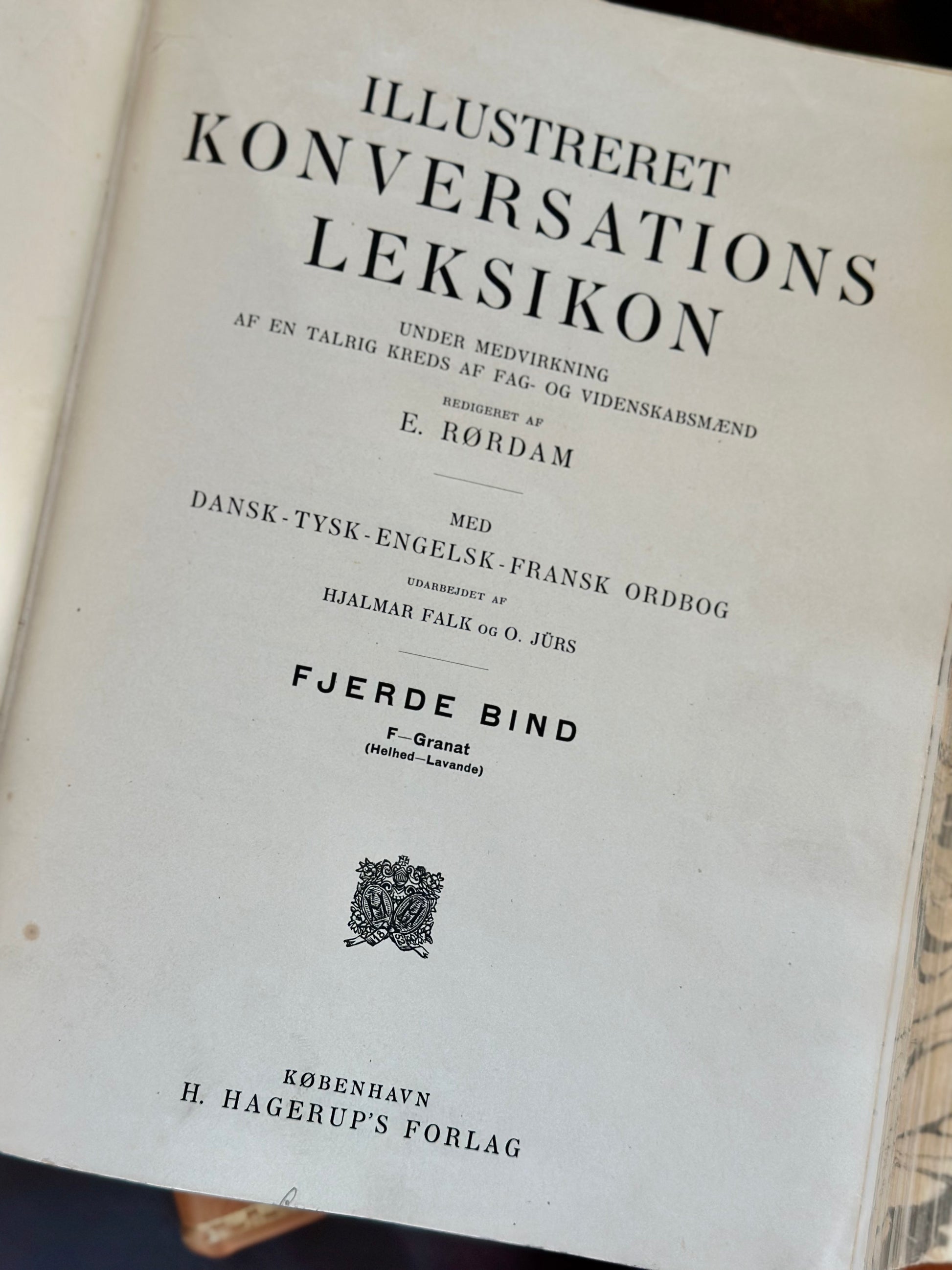 The orange cover book is a Danish encyclopedia published in 1909 in Copenhagen.