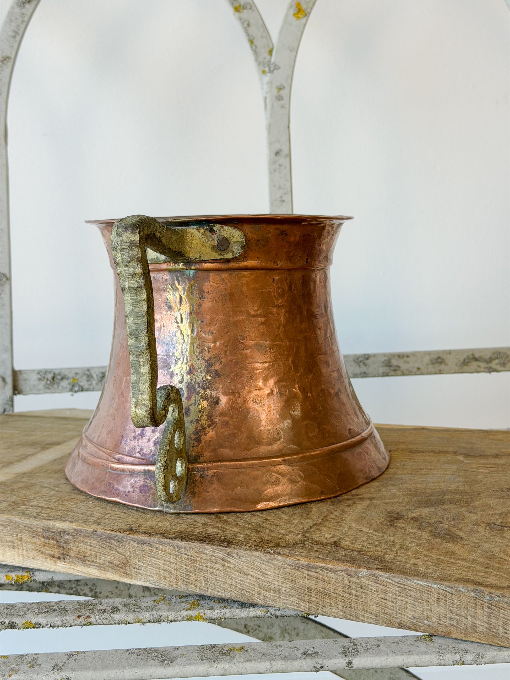 Scrolled handle is made of cast brass. This piece could have been used as a ‘measure,’ or a vessel with a standardized capacity like pint or quart, in a 19th century kitchen. This piece is no longer watertight.