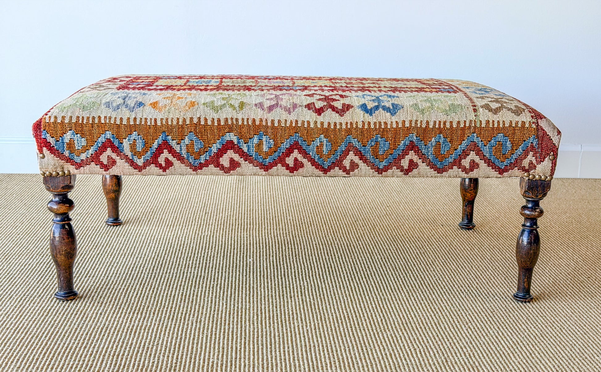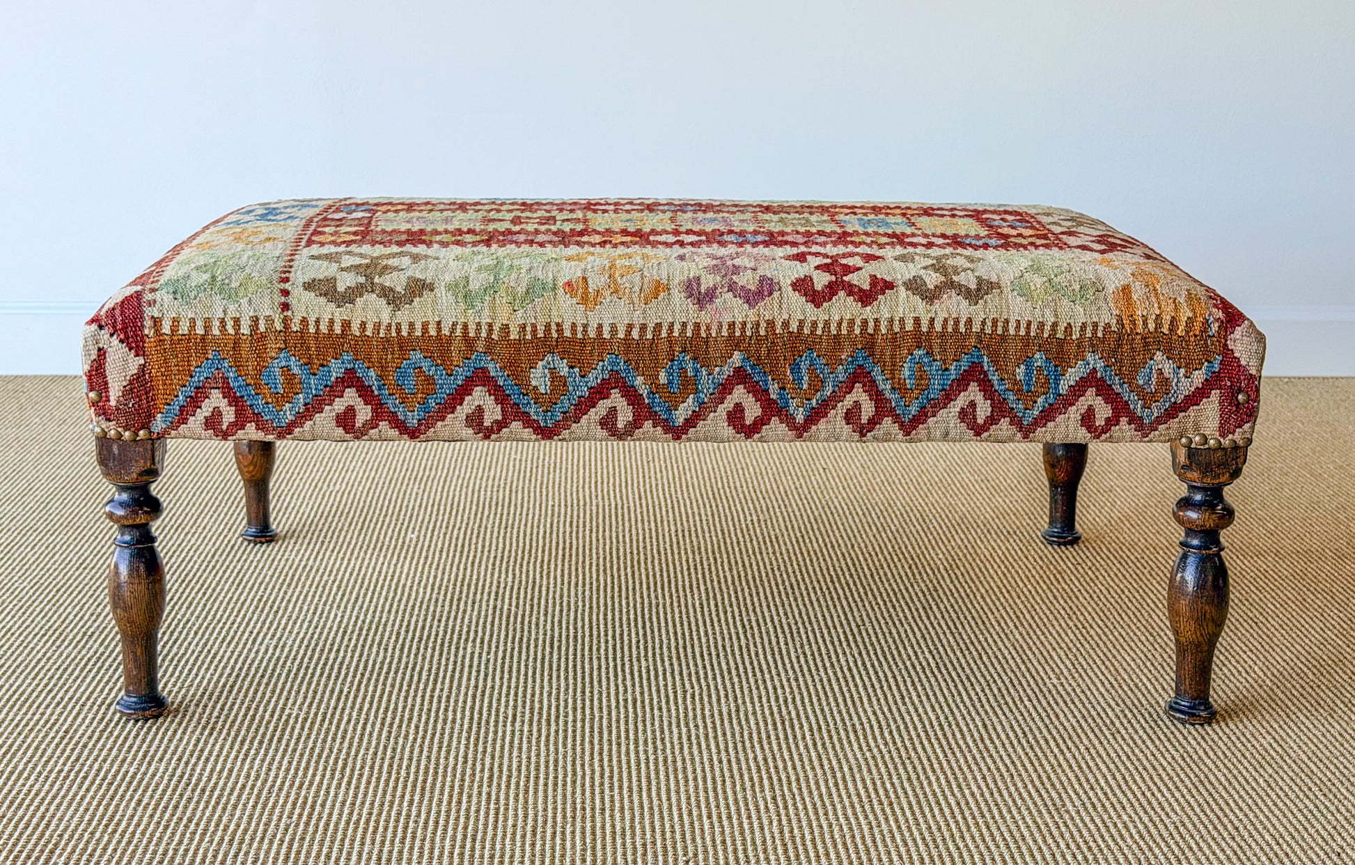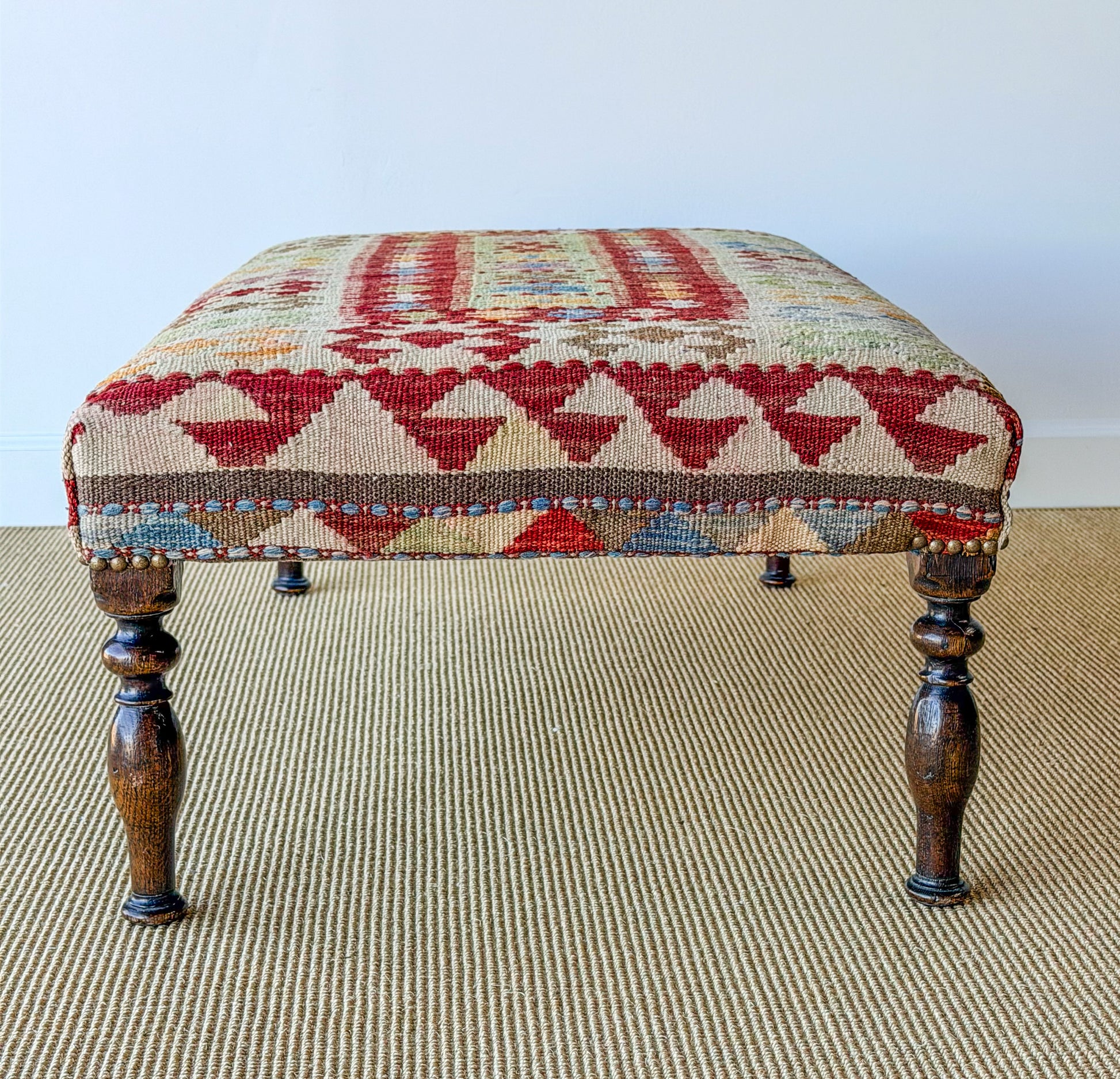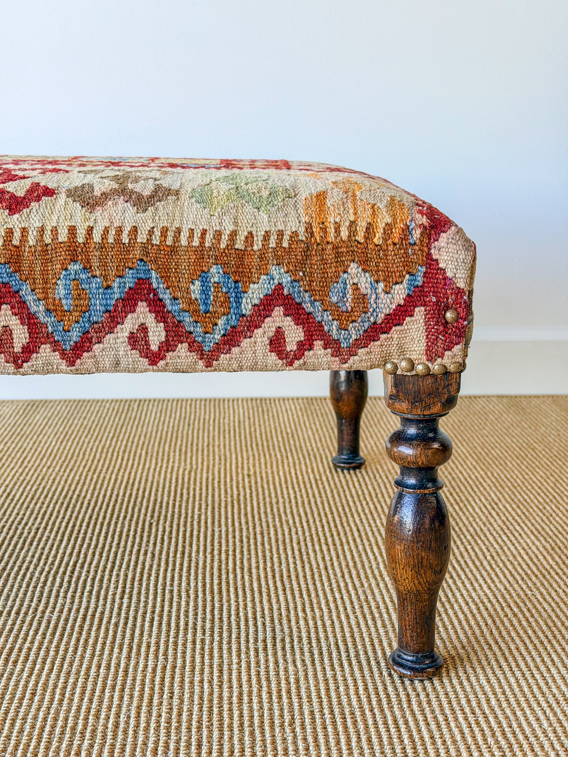 A hand-selected antique Kilim rug was used to upholster this footstool, and legs were cut from an antique chair. This piece is truly one-of-a-kind - you won’t find another just like it.