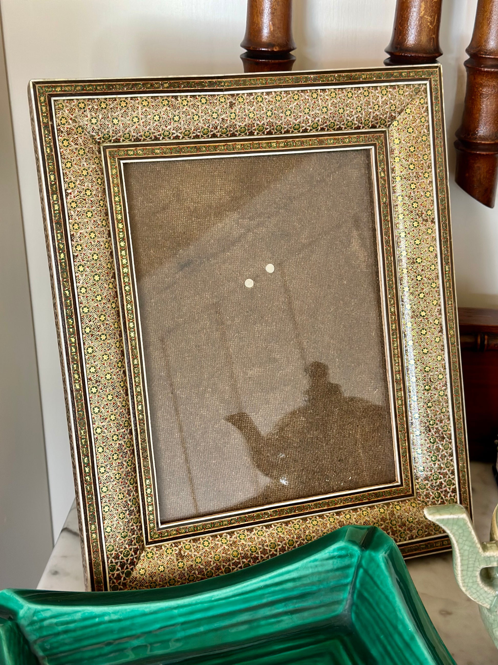 The craftmanship on this frame is beyond incredible - made in the Khatam technique of inlaying a piece of wood with smaller bits of wood, bone, and metal in geometric patterns. The result is a work of art and such a special piece for a special photo. My guess is this one is an oldie as it has nails securing the back in place.
