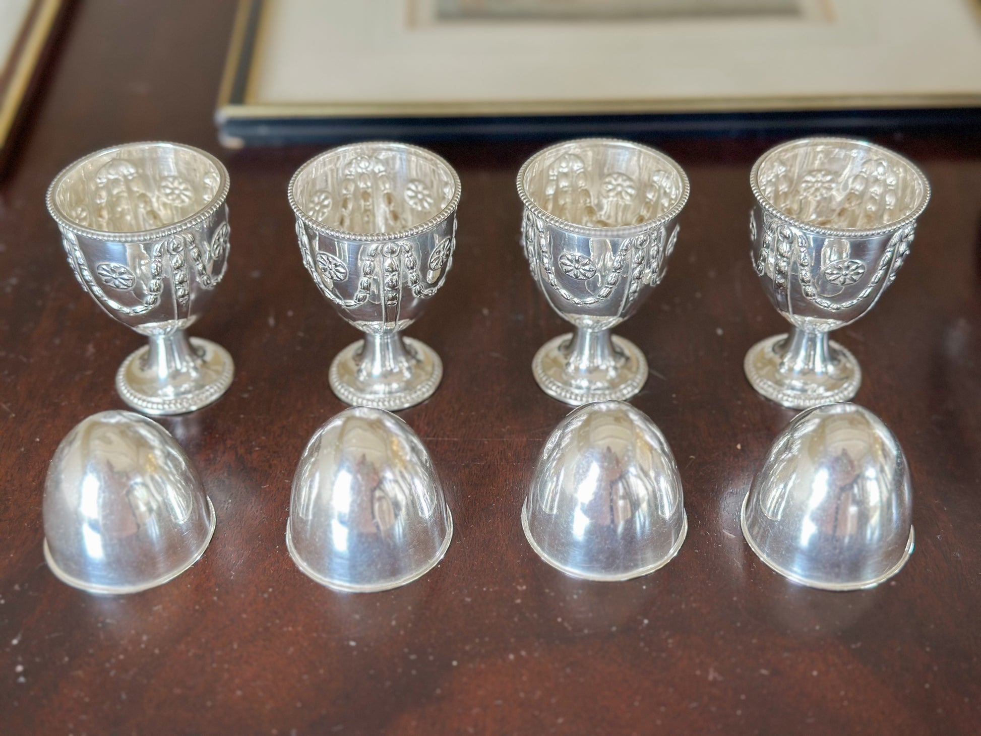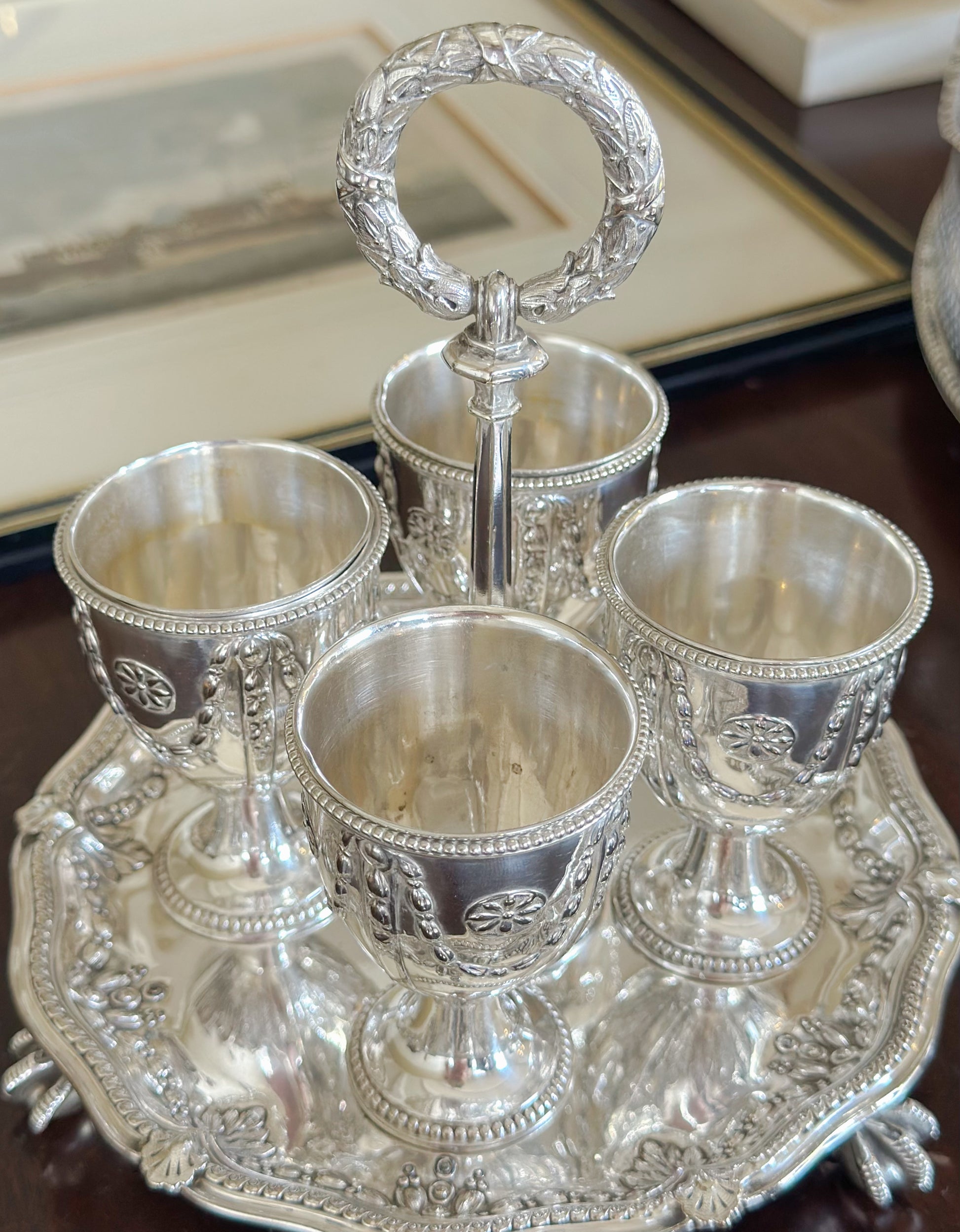 Condition Notes: There is shockingly little plate loss on this piece, considering its age. There is some stubborn tarnish around the designs with deeper grooves. The stand is level and the center handle piece is straight and secure thanks to recent repair. Two of the egg cups were also leveled during this repair to ensure they could stand alone.Â