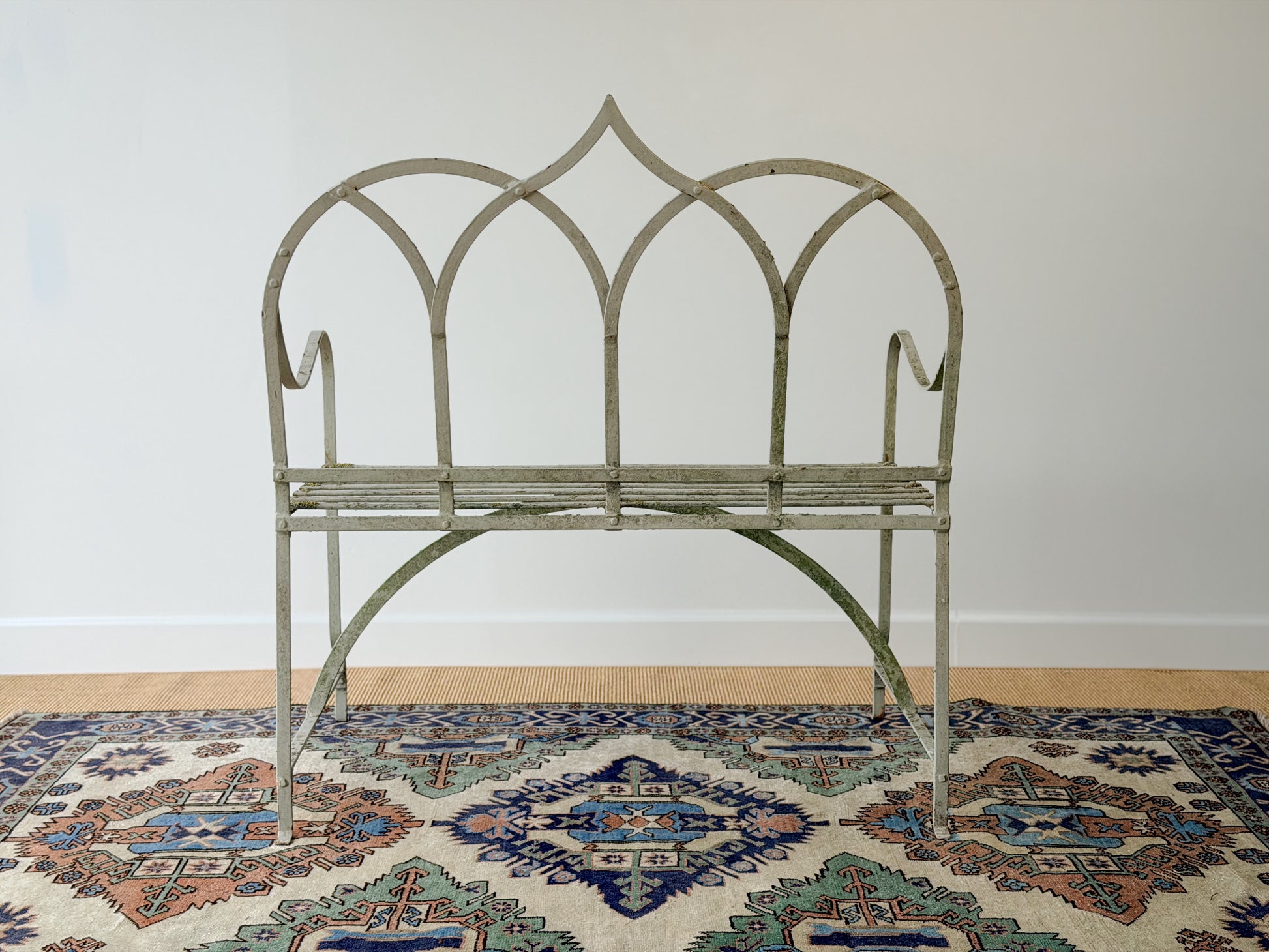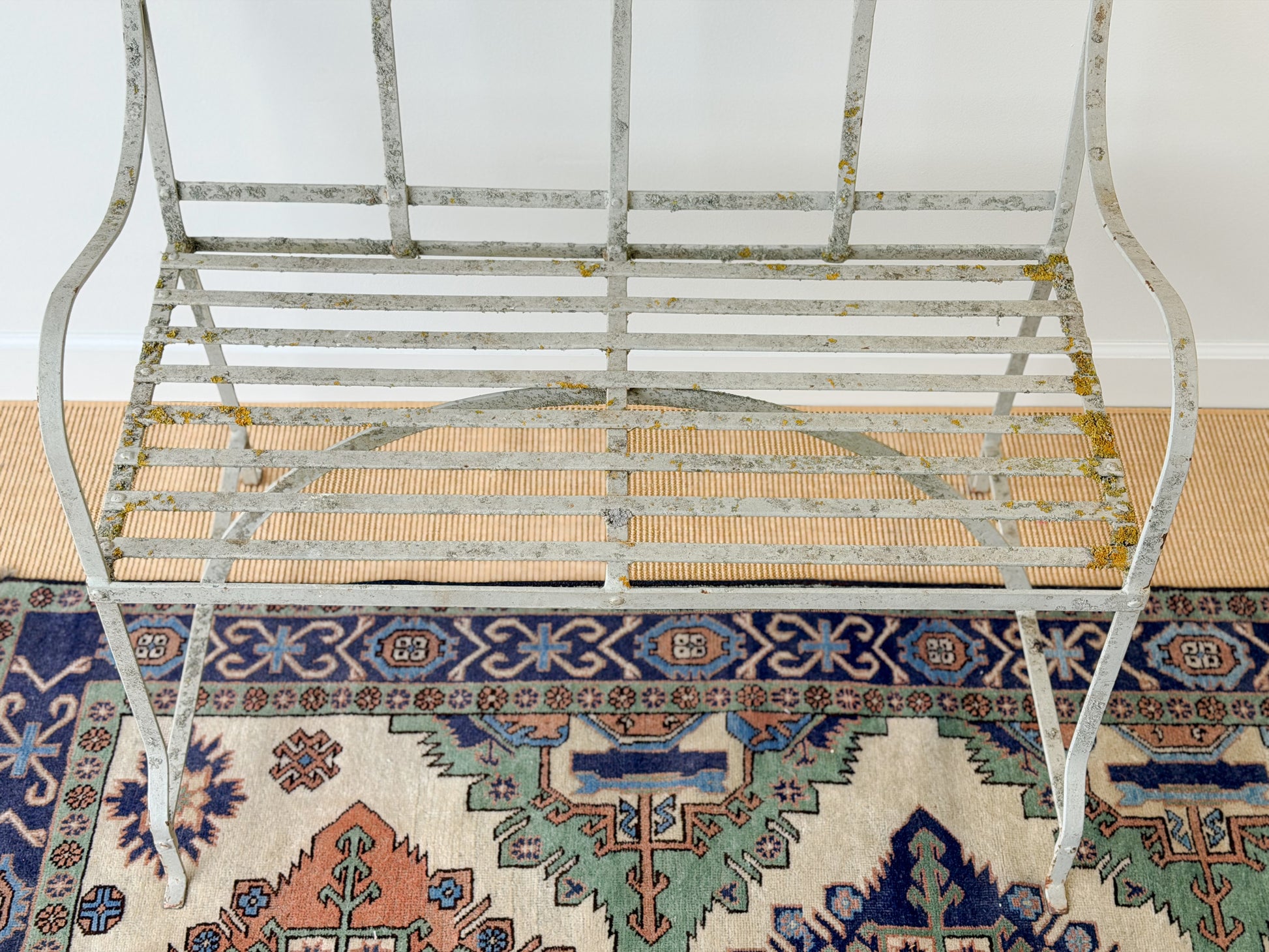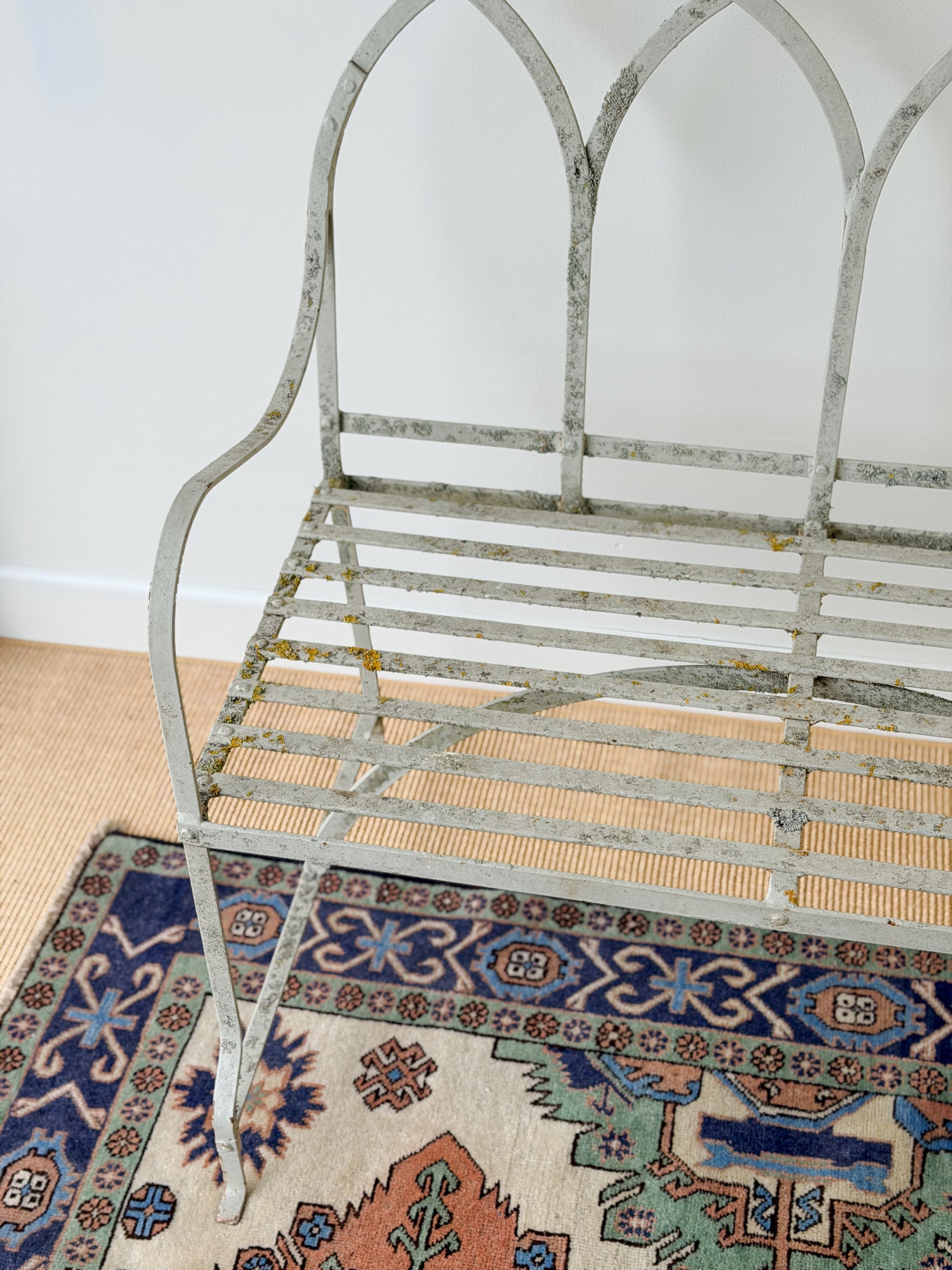 The architectural elements of this garden bench - the arched back, slatted seat, gently scrolled arms - absolutely send me to the moon. And then we have the (naturally!) preserved moss and lichen that have made their way across the pond along with this piece. Likely originally made to be placed in an outdoor garden or conservatory, this bench will be beautiful in an entryway, sunroom, at the foot of a bed, or in one of its originally intended spaces.