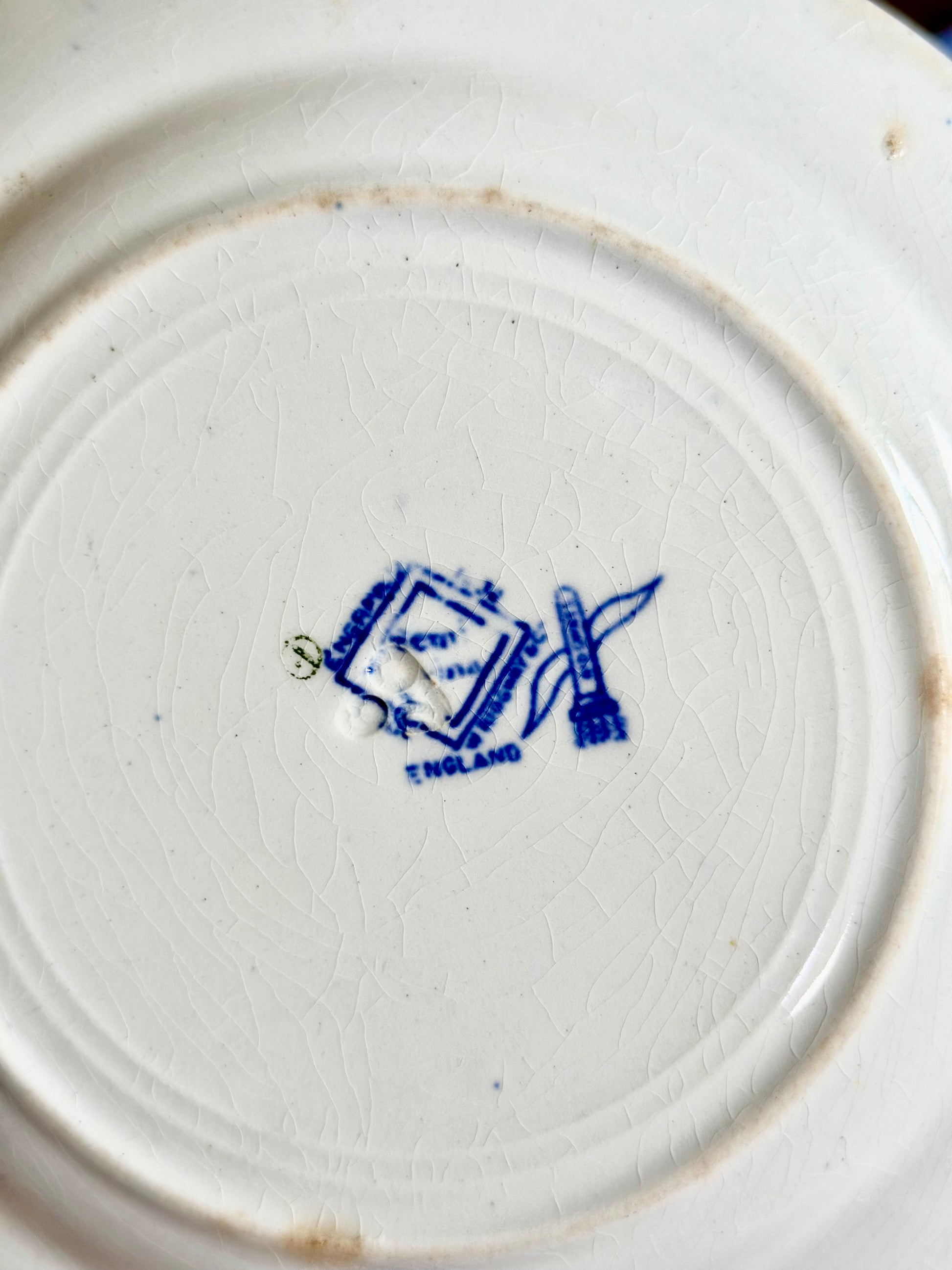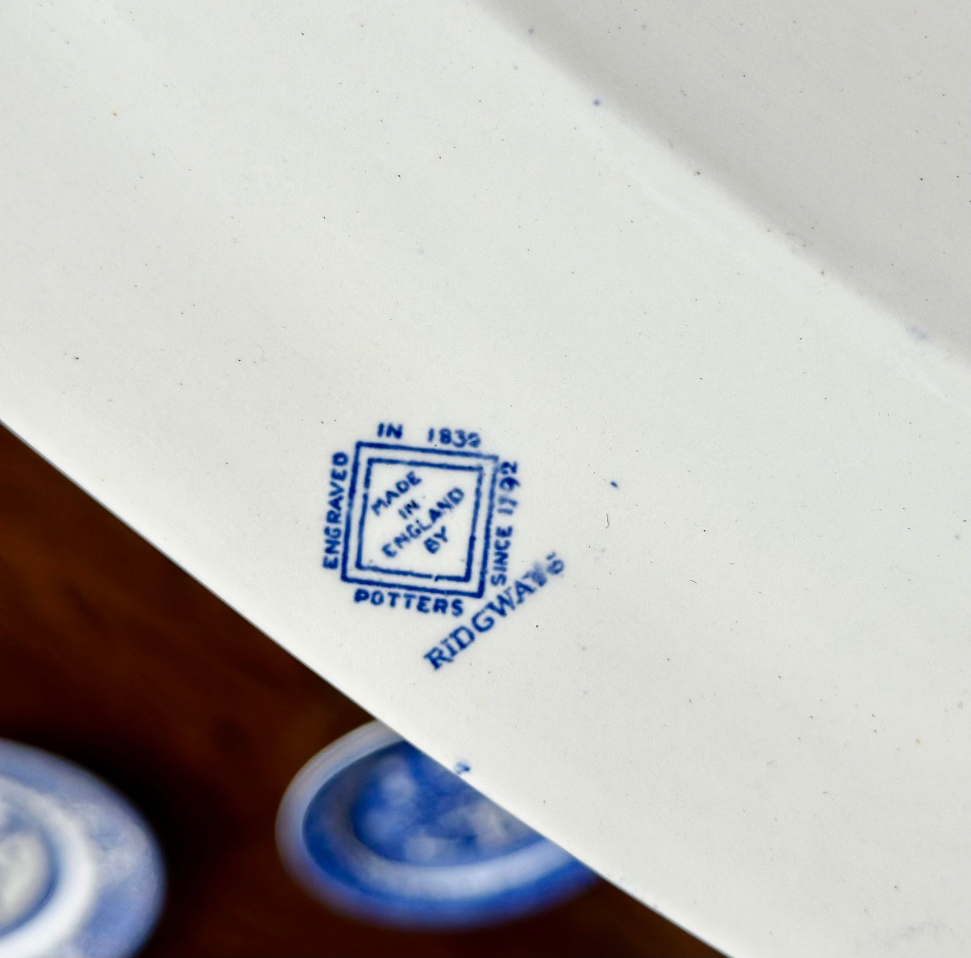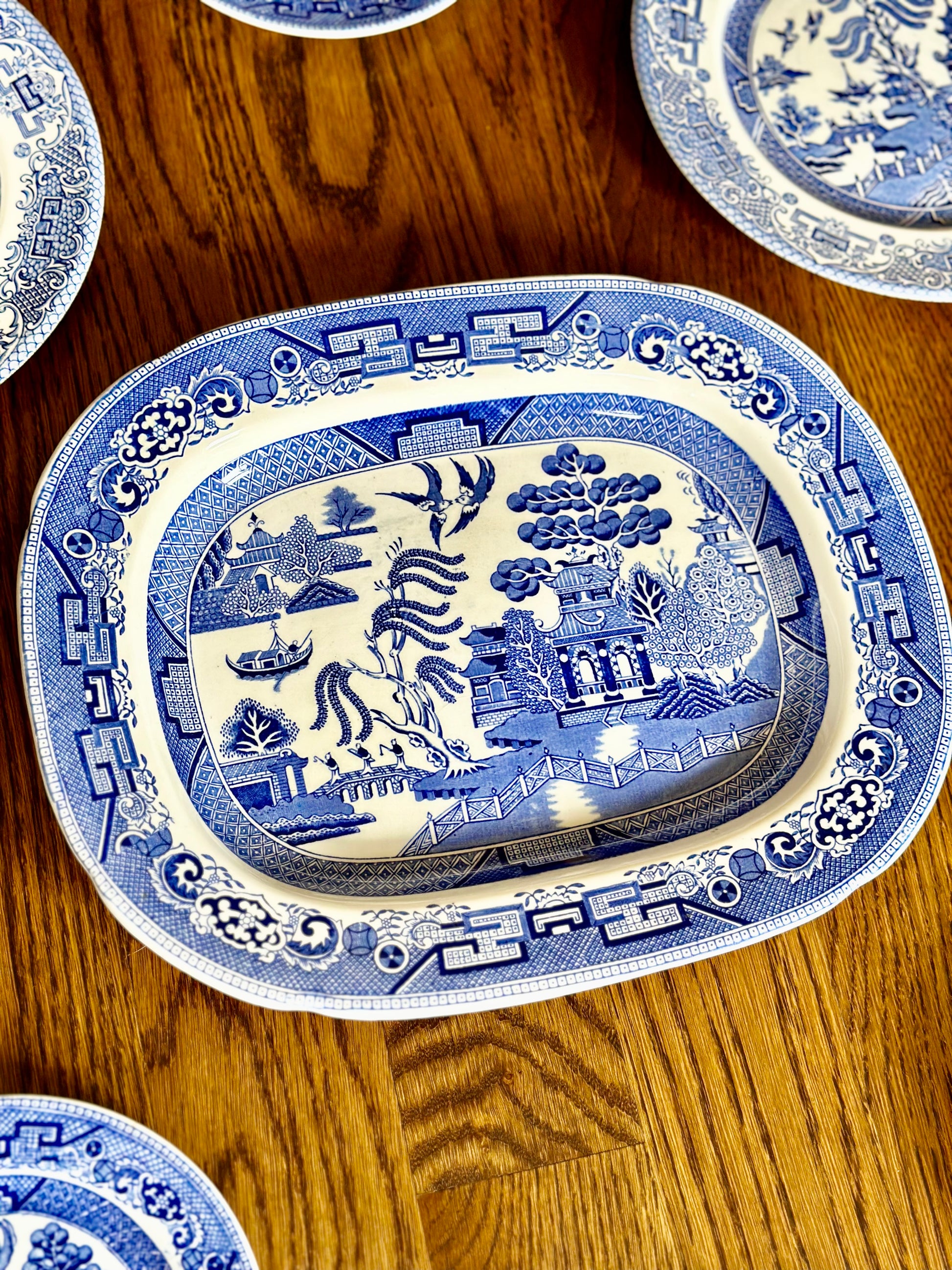 This set is comprised of real deal, antique ironstone Blue Willow pieces. 7 of the 9 pieces are stamped with maker’s marks. The two large round plates do not have maker’s marks. Such a beautiful, classic collection of plates that have truly stood the test of time!