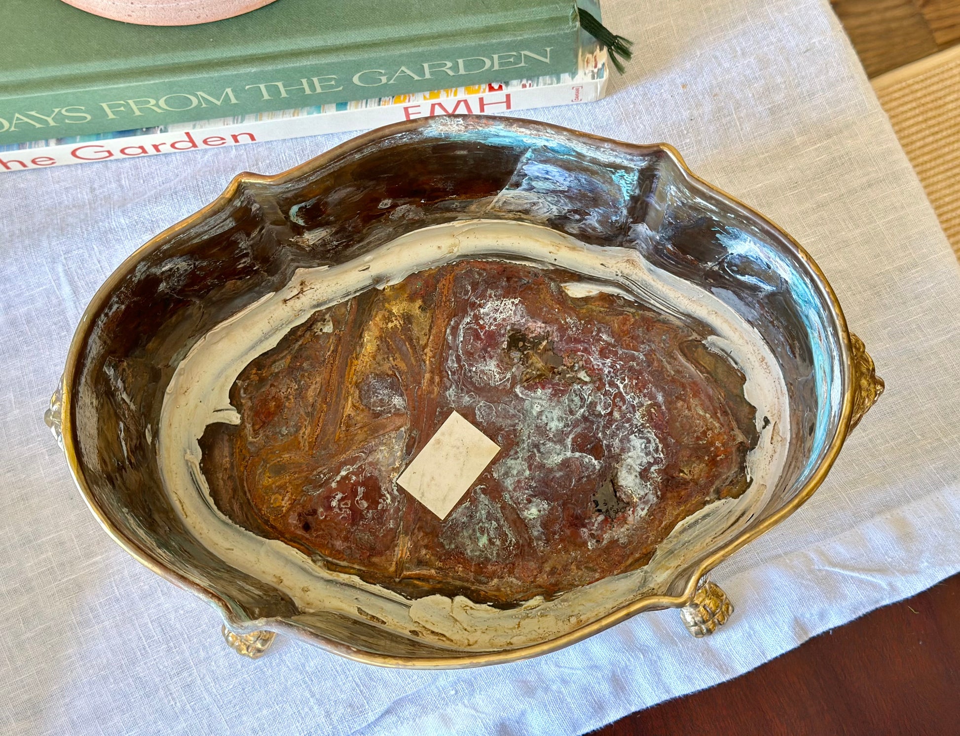 Surface scratches and some areas of noticeable wear. Two feet are slightly uneven causing a bit of a wobble. Interior has been caulked so the jardiniere is water tight! Imperfections factored into price.