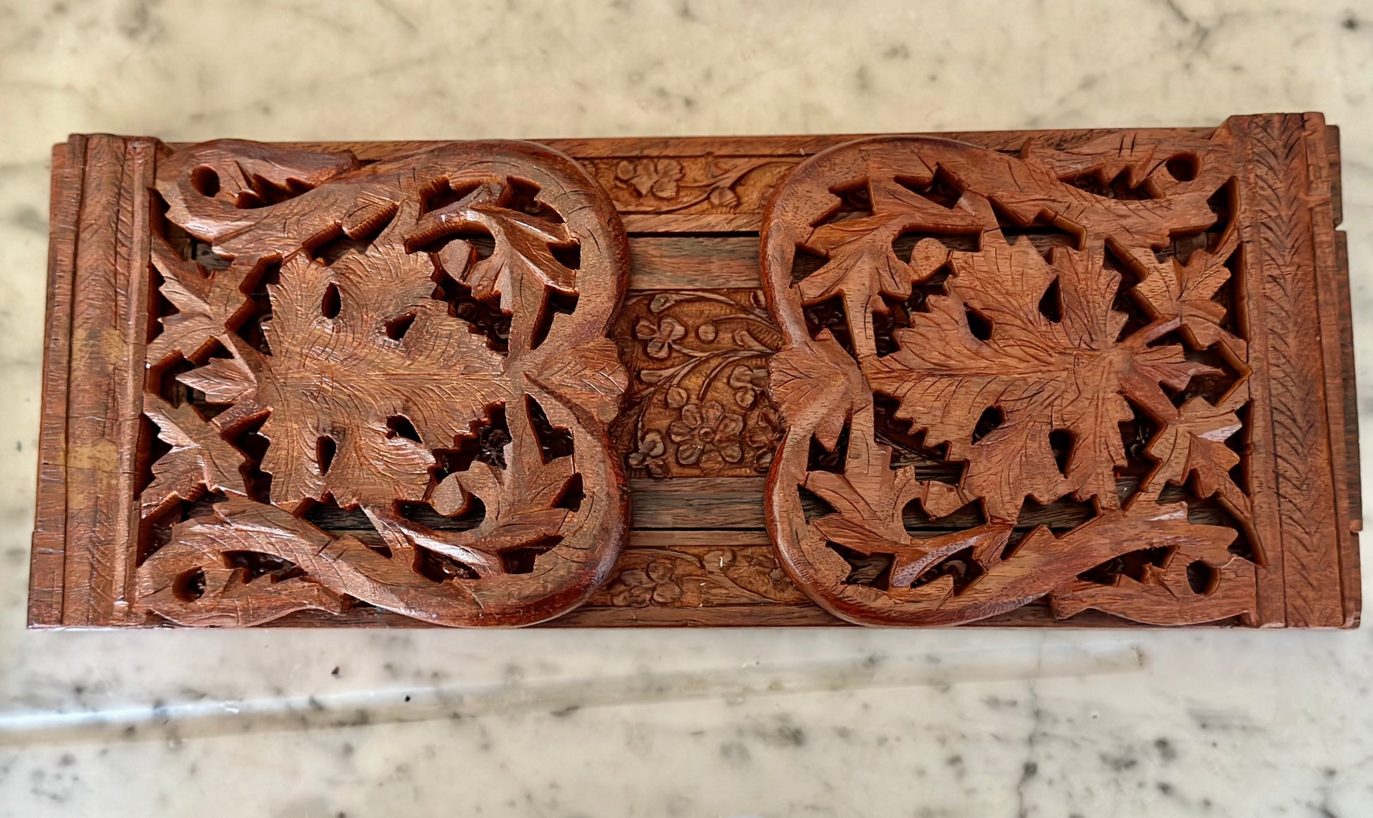 The wood and carvings are in beautiful condition with no obvious imperfections. Missing a screw in one of the hinges but absolutely useable as-is, or an easy fix.