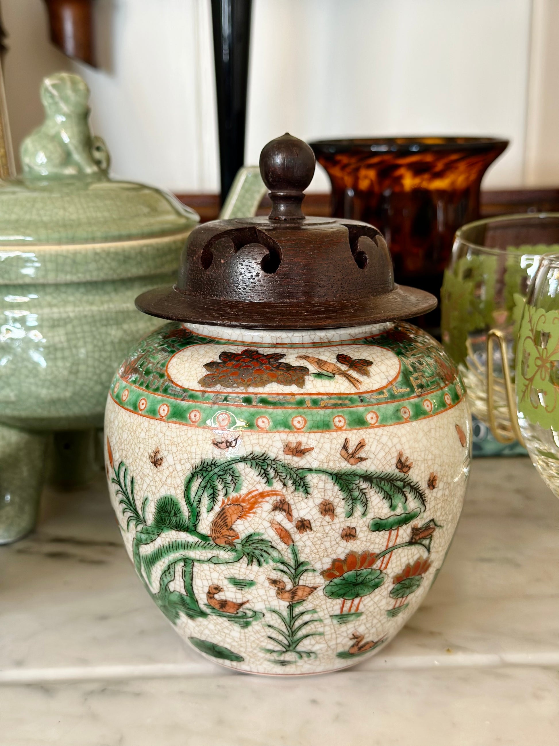 Exquisite little ginger jar with an orange and green lily pond design with gold accents and crackle glaze. The wooden lid tops it off! I’d use this one without the lid for a small flower arrangement or on a bookshelf with its topper.