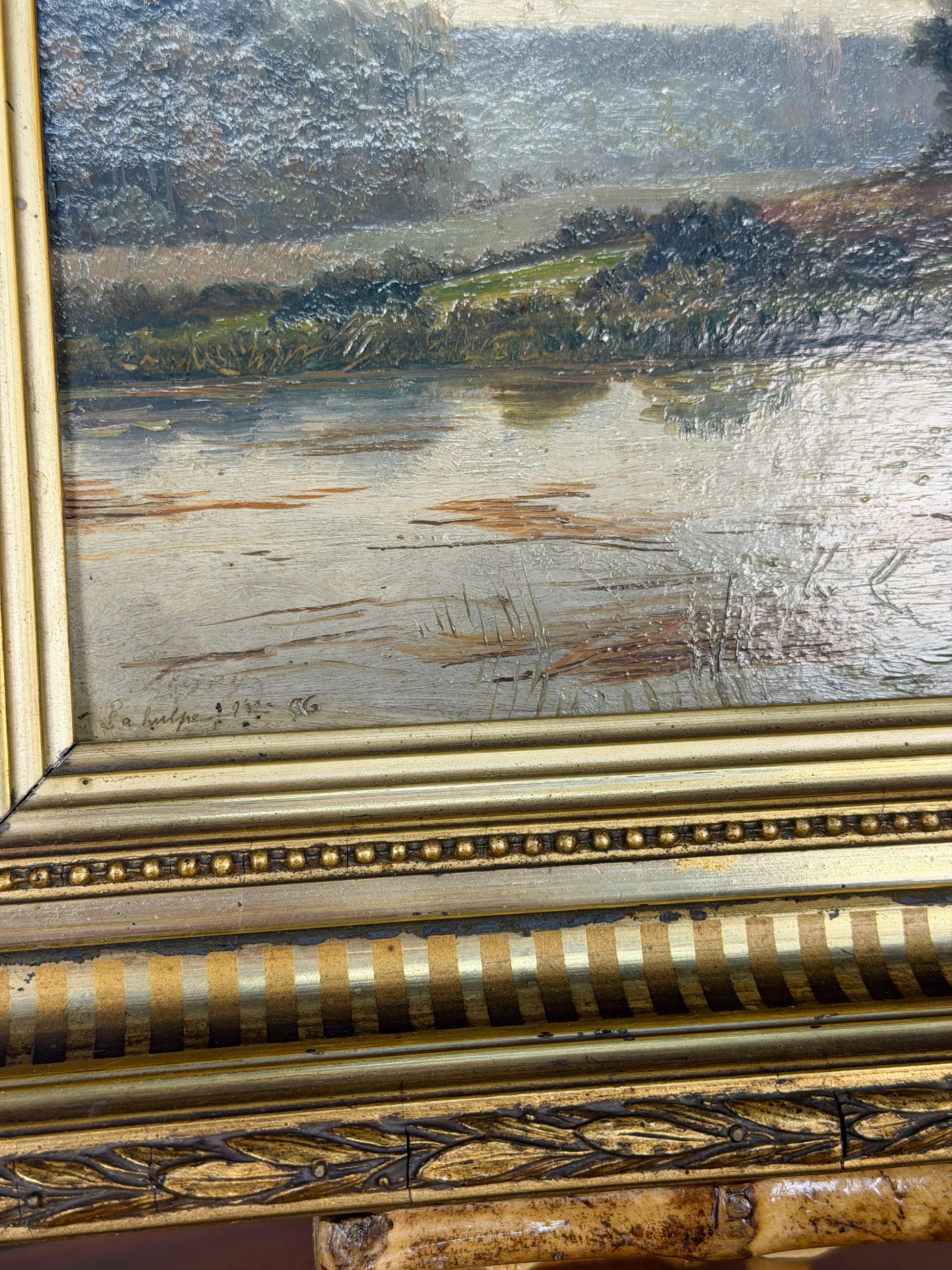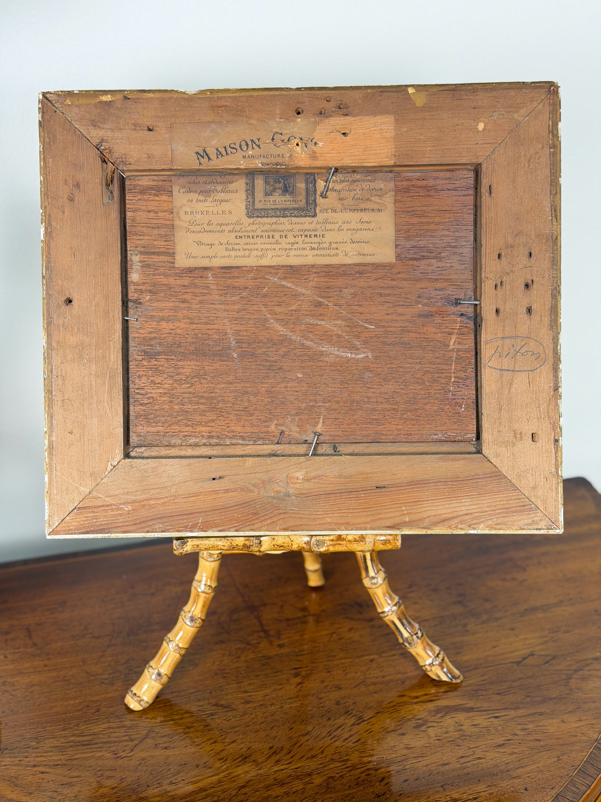 The frame is in original condition and has sustained some wear and damage. Based on the label on the back it is likely original to the piece, and if not original, was made relatively soon after the painting was completed. The label also tells us this painting has most likely lived all of its life to date in or around Brussels, as the framemaker was located in the city.