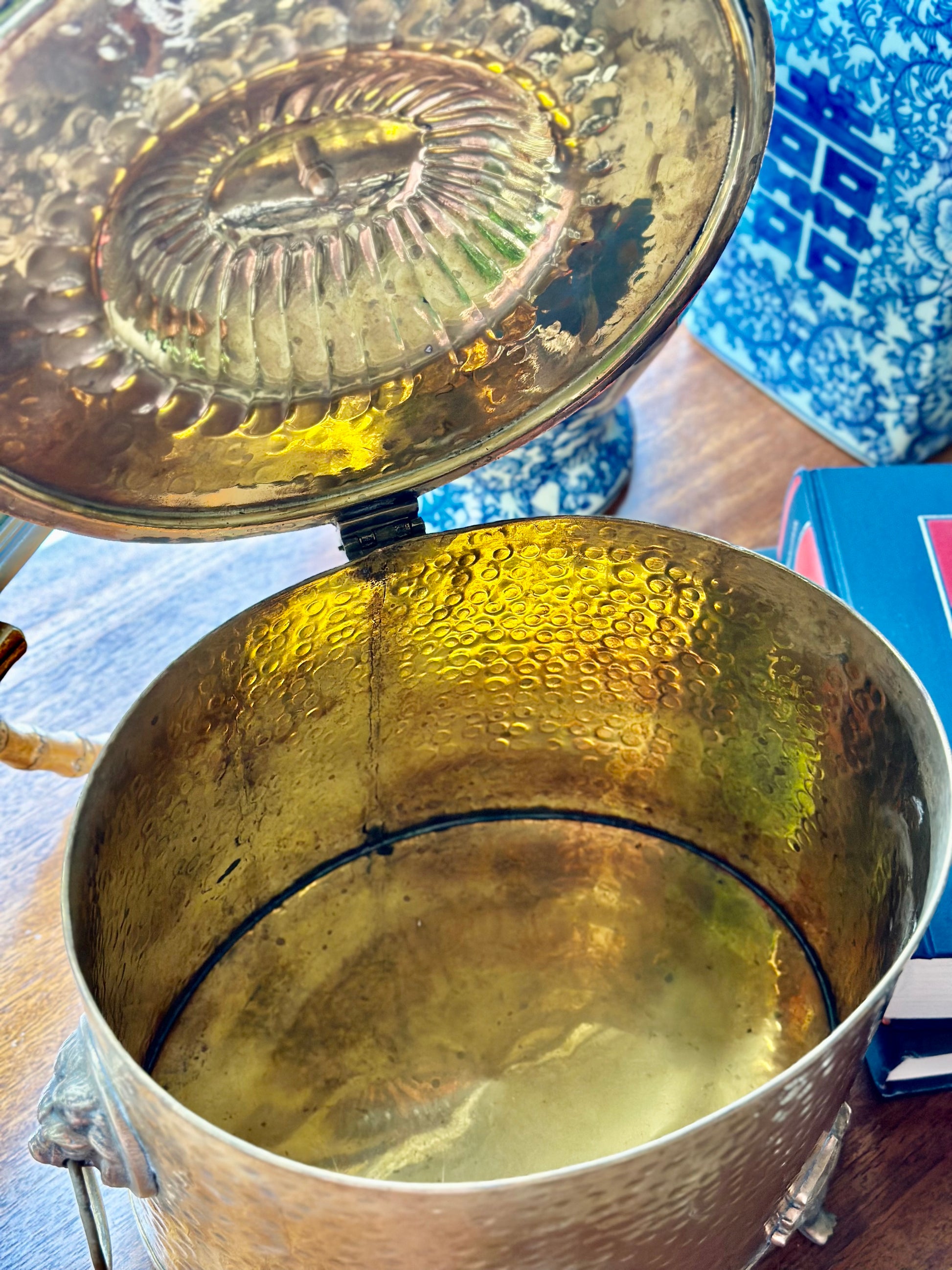 Some surface imperfections on edge of lid and front of bucket, as well as some wear to brass finish around where feet are attached.