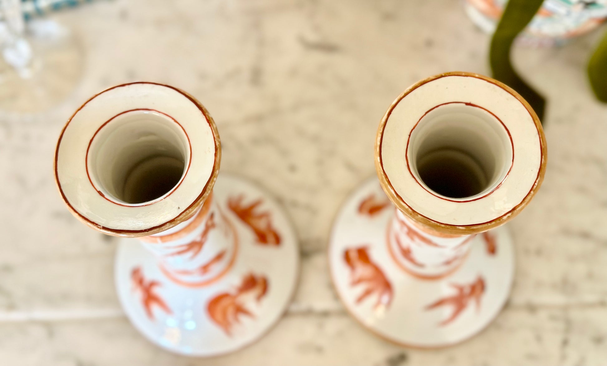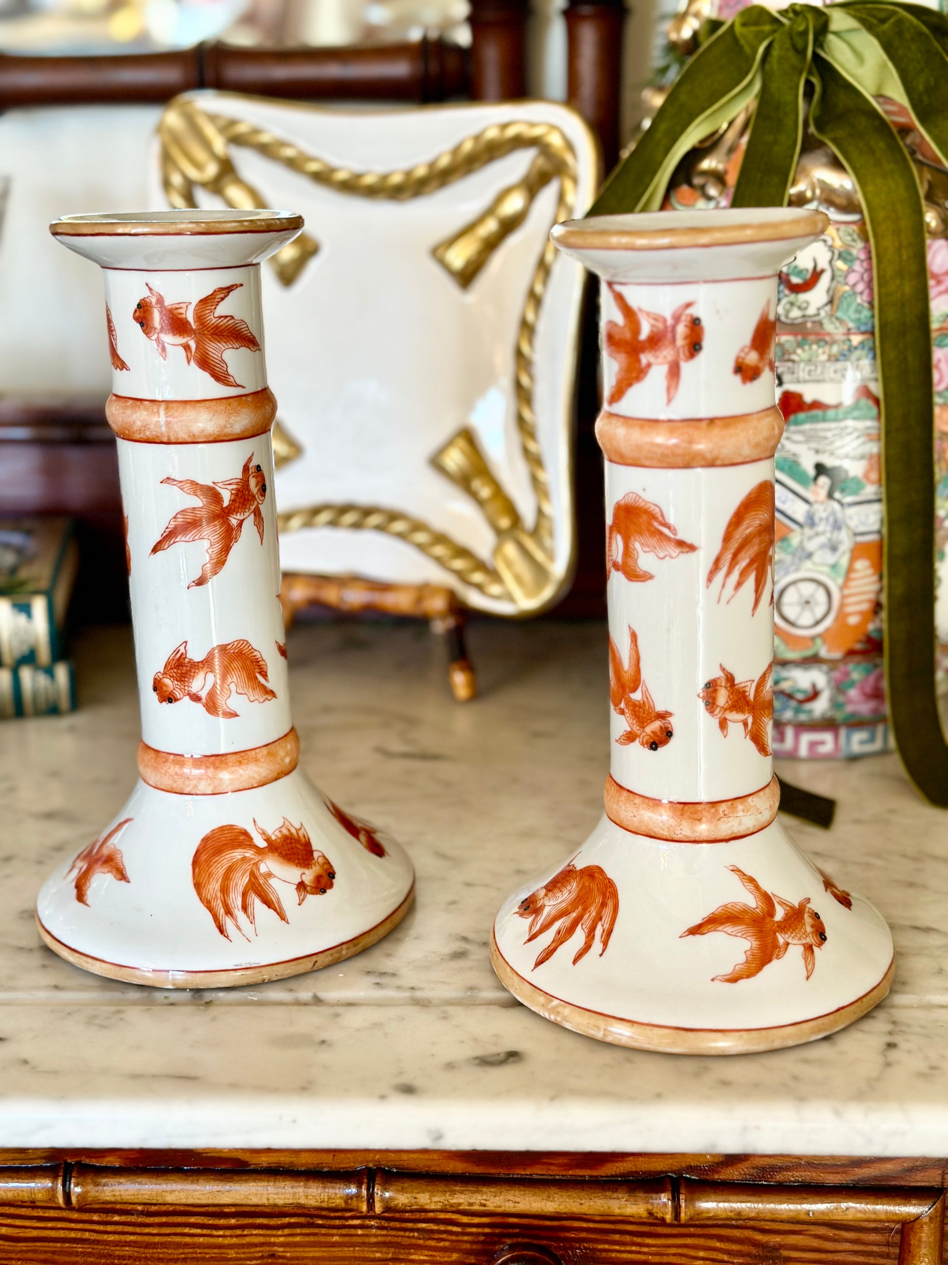 Handpainted Koi Fish Porcelain Candlestick Pair