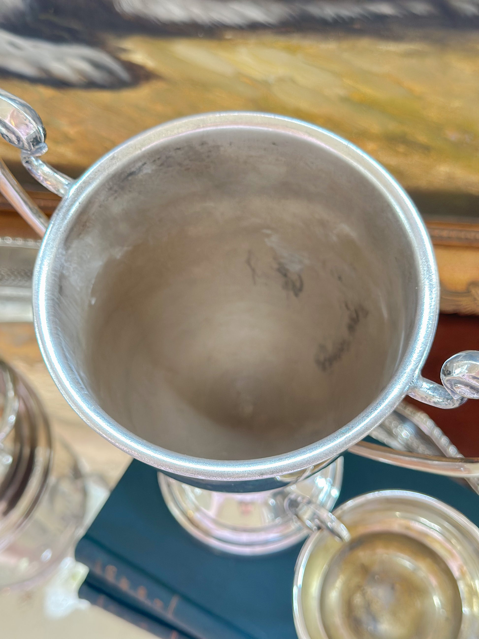 Condition Notes: Wear to surface of cup as expected, patina remains consistently around the surface of the cup after polishing, small dents around base of pedestal