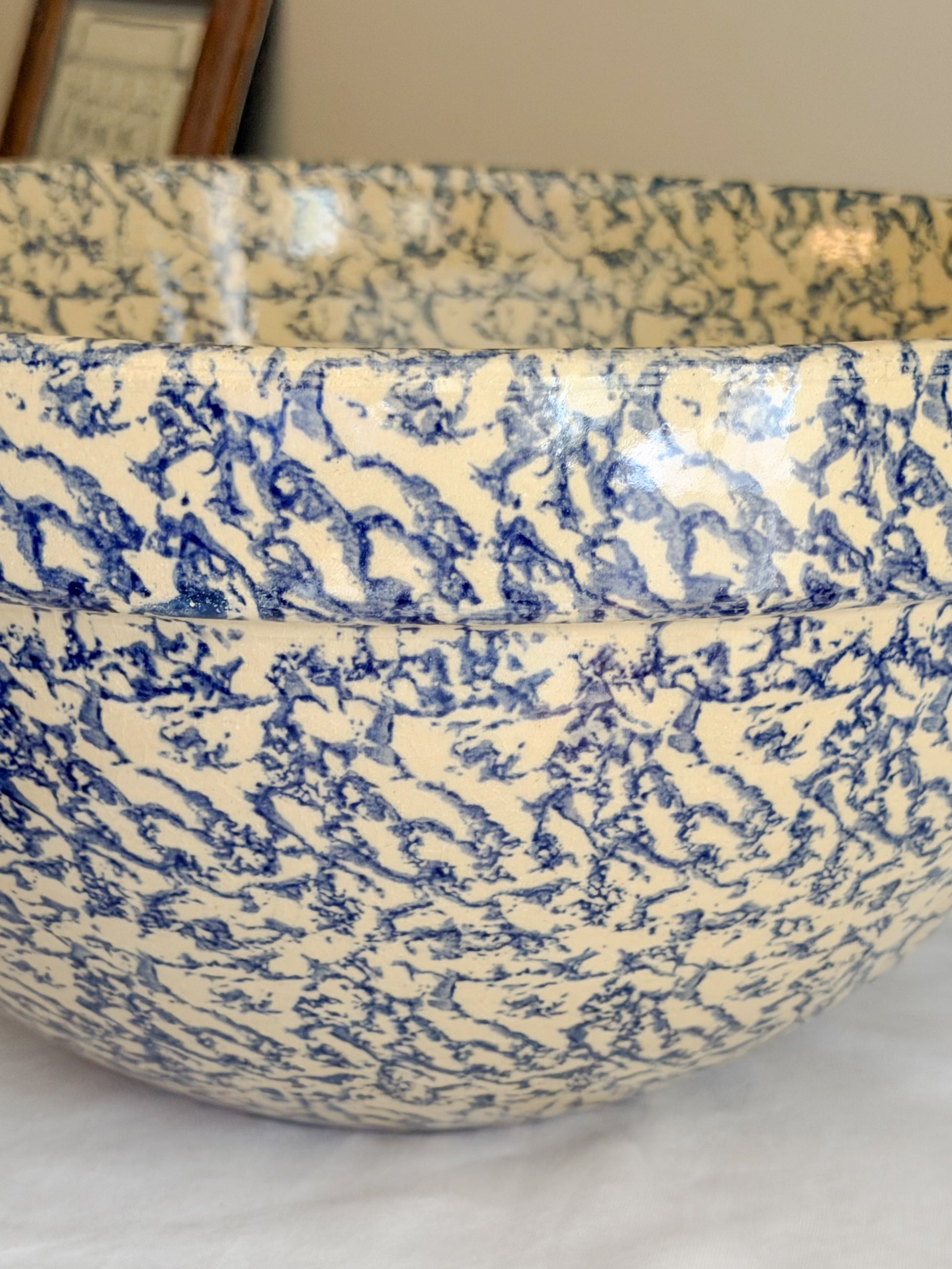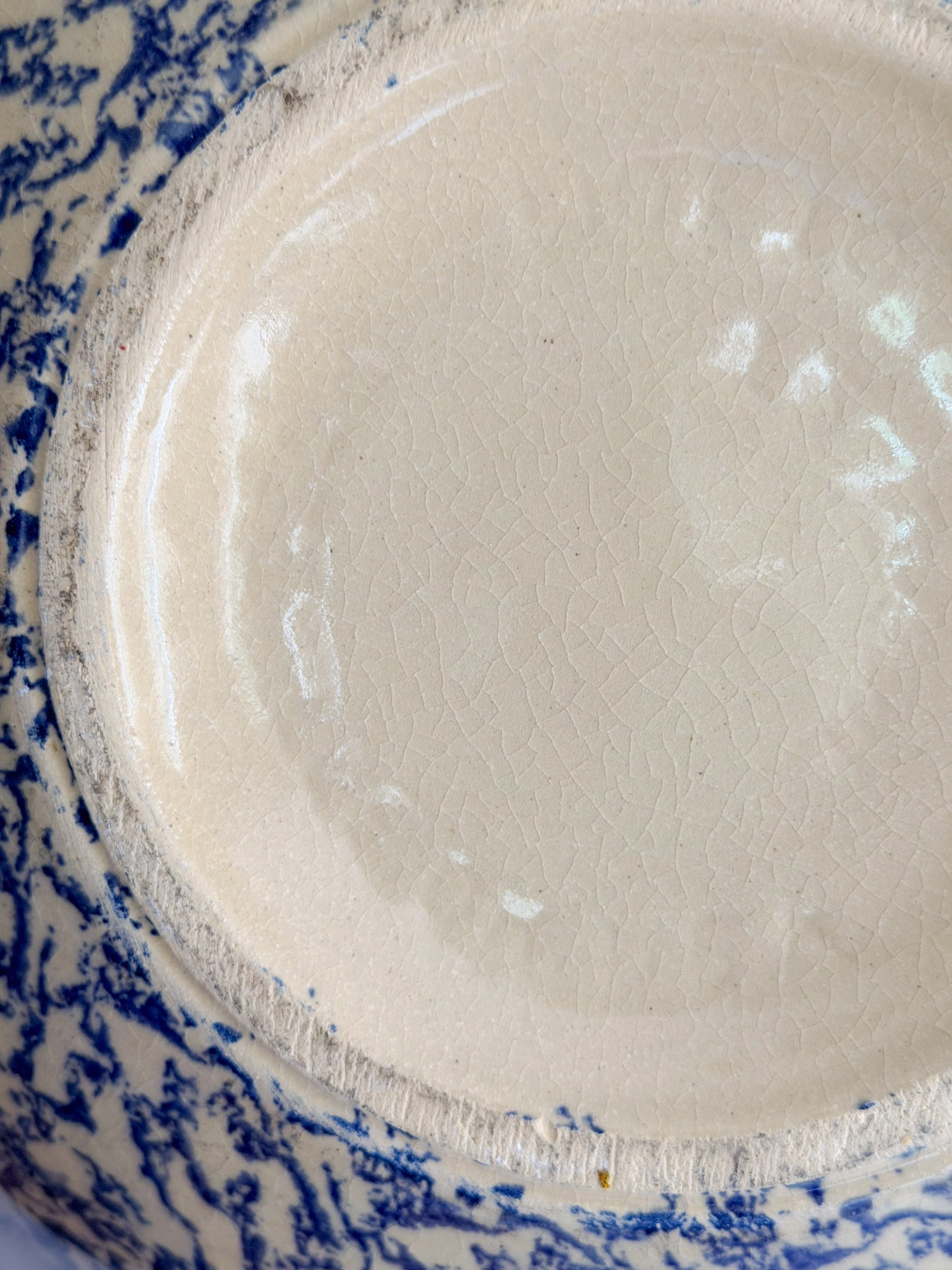 Maker: Unknown; stamp on the bottom of the bowl that notes it was made in “Roseville, OH U.S.A” is just barely legible. Specific maker is stamped as well but not legible. The presence of a stamp into the clay, versus an inked stamp, indicates this bowl could be quite old although I was not able to identify age with confidence. Its smooth surface all around indicates that it is not antique (much older products would have uneven surface).