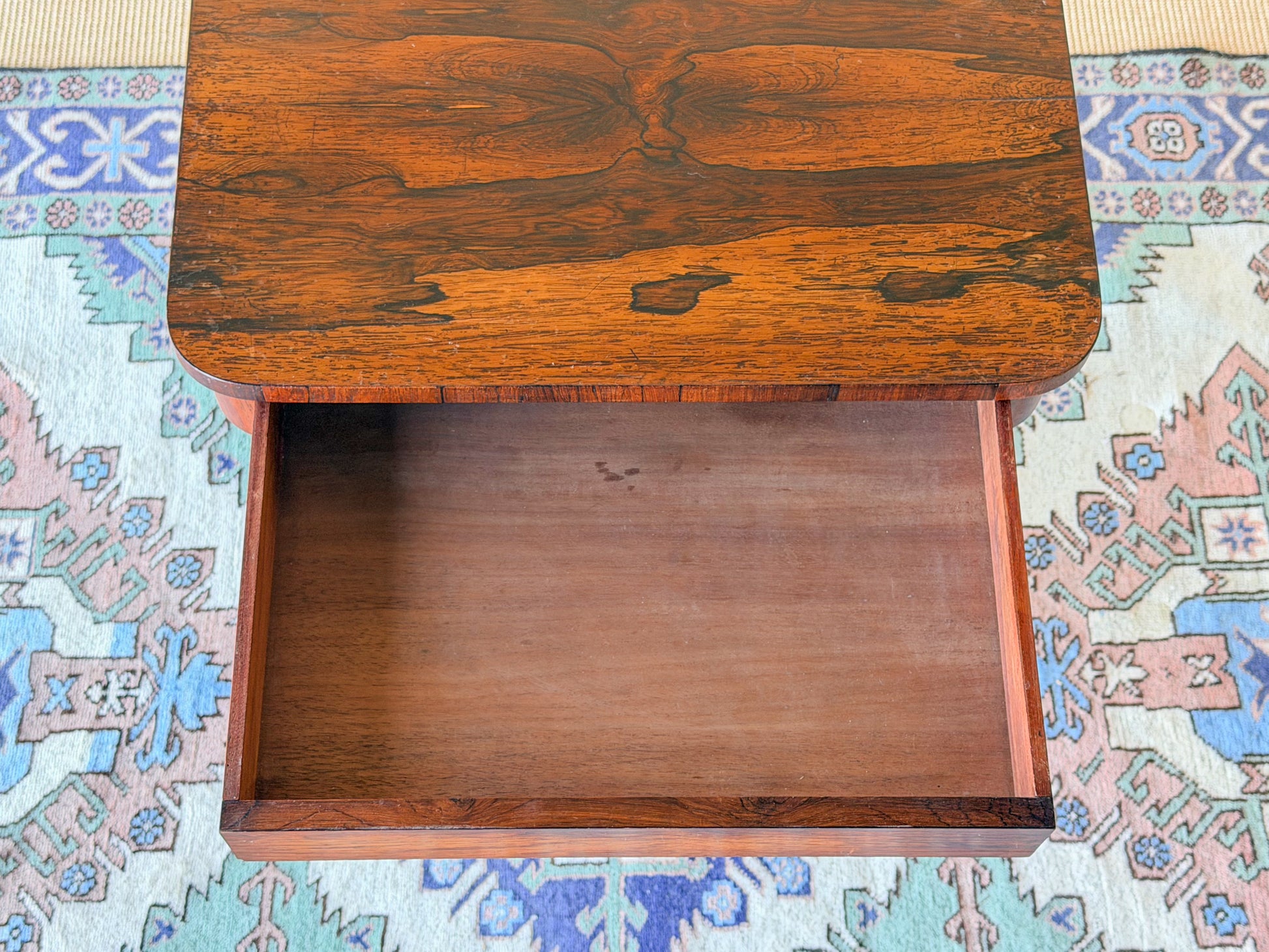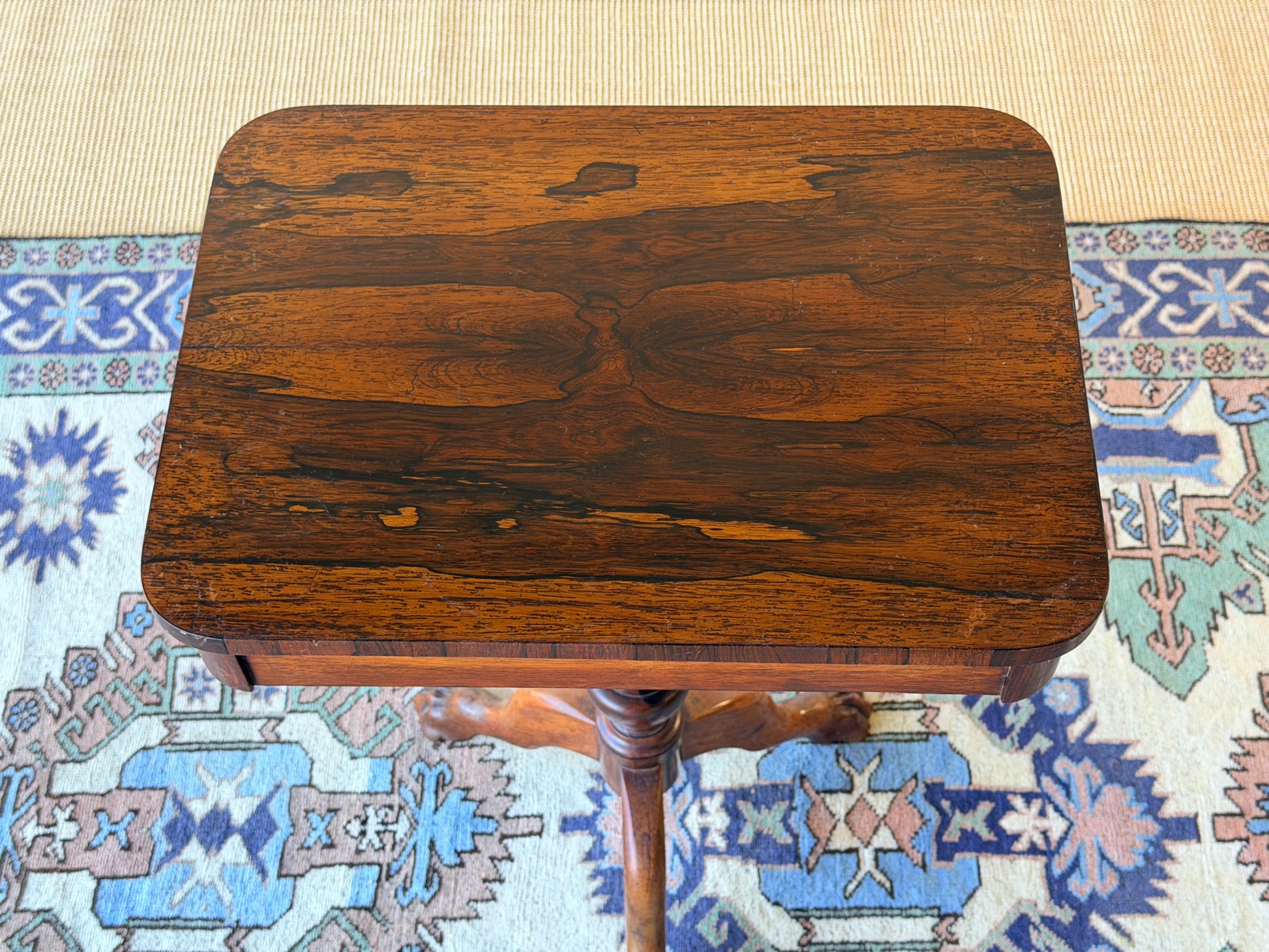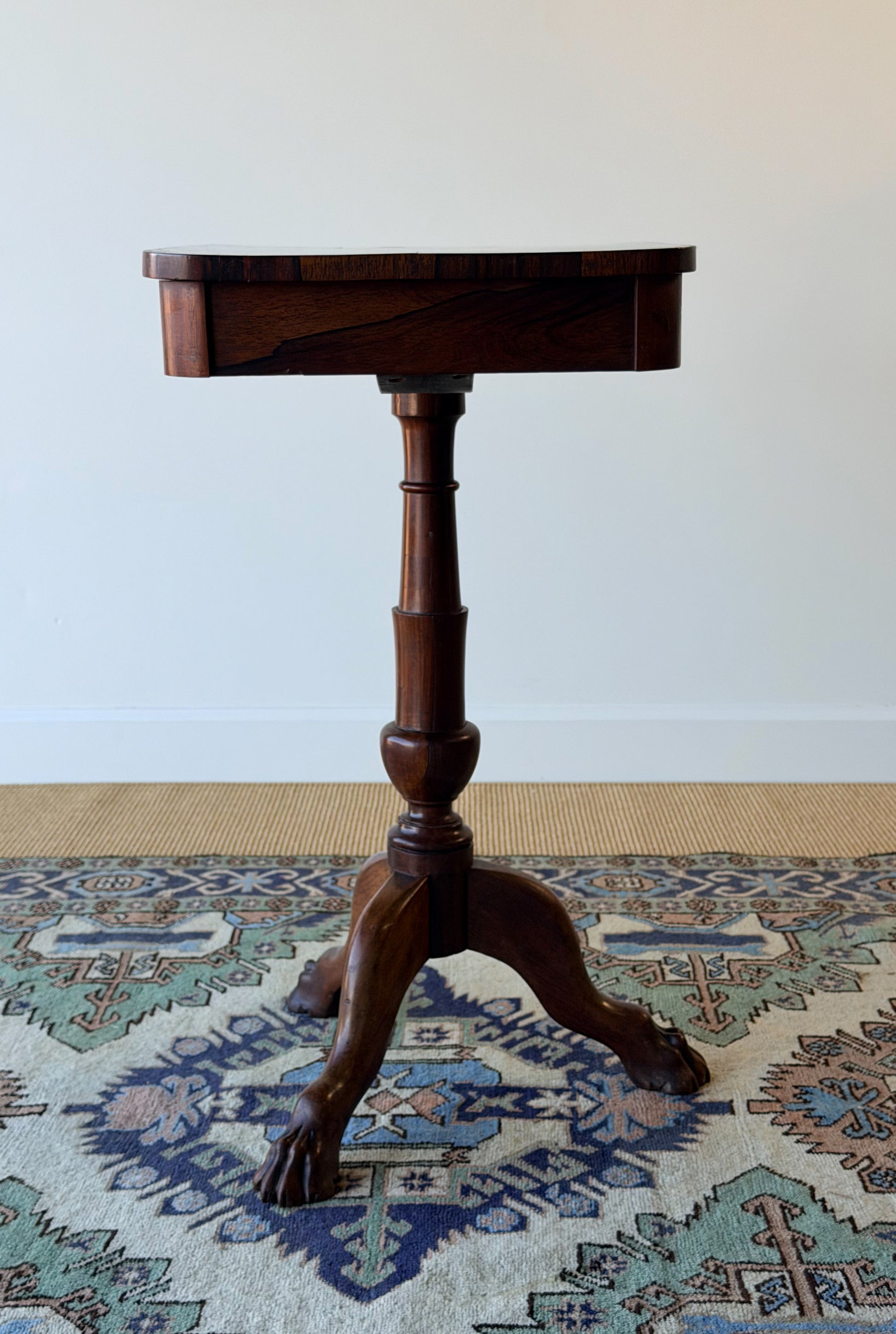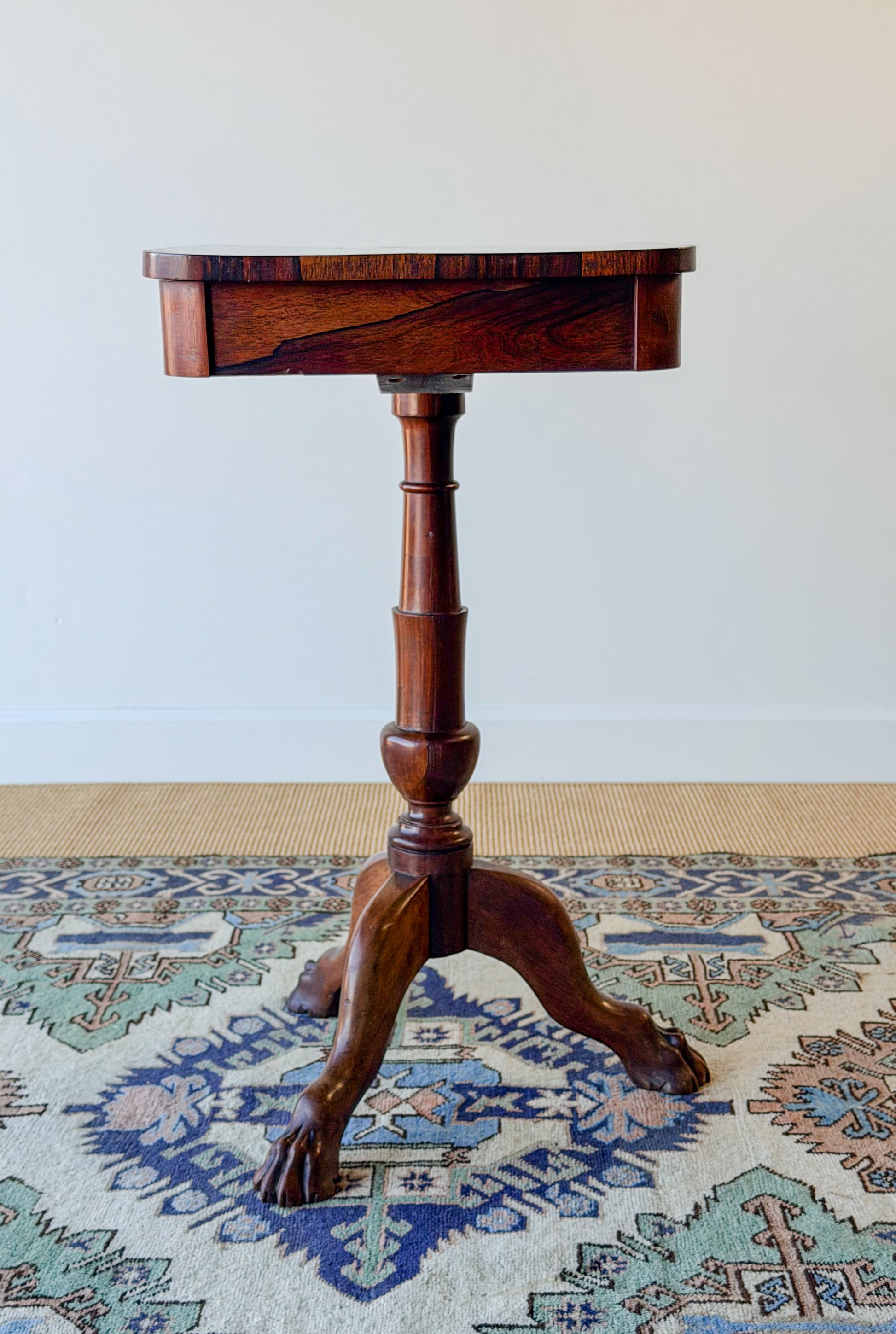 With bold claw feet typical of Georgian-period design, this side table is crafted from richly grained hardwood, likely mahogany or rosewood-veneered mahogany. The rectangular top displays striking, book-matched figuring with a warm, mellow patina developed over generations of use. Lucky for us, it will blend with a number of interior styles today.