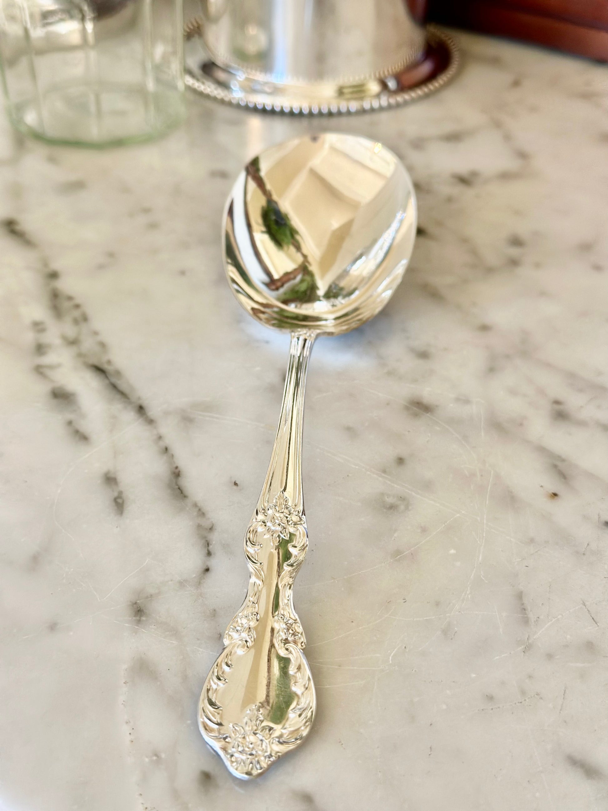 Large serving spoon with flower basket pattern: Holmes & Edwards; 9”L