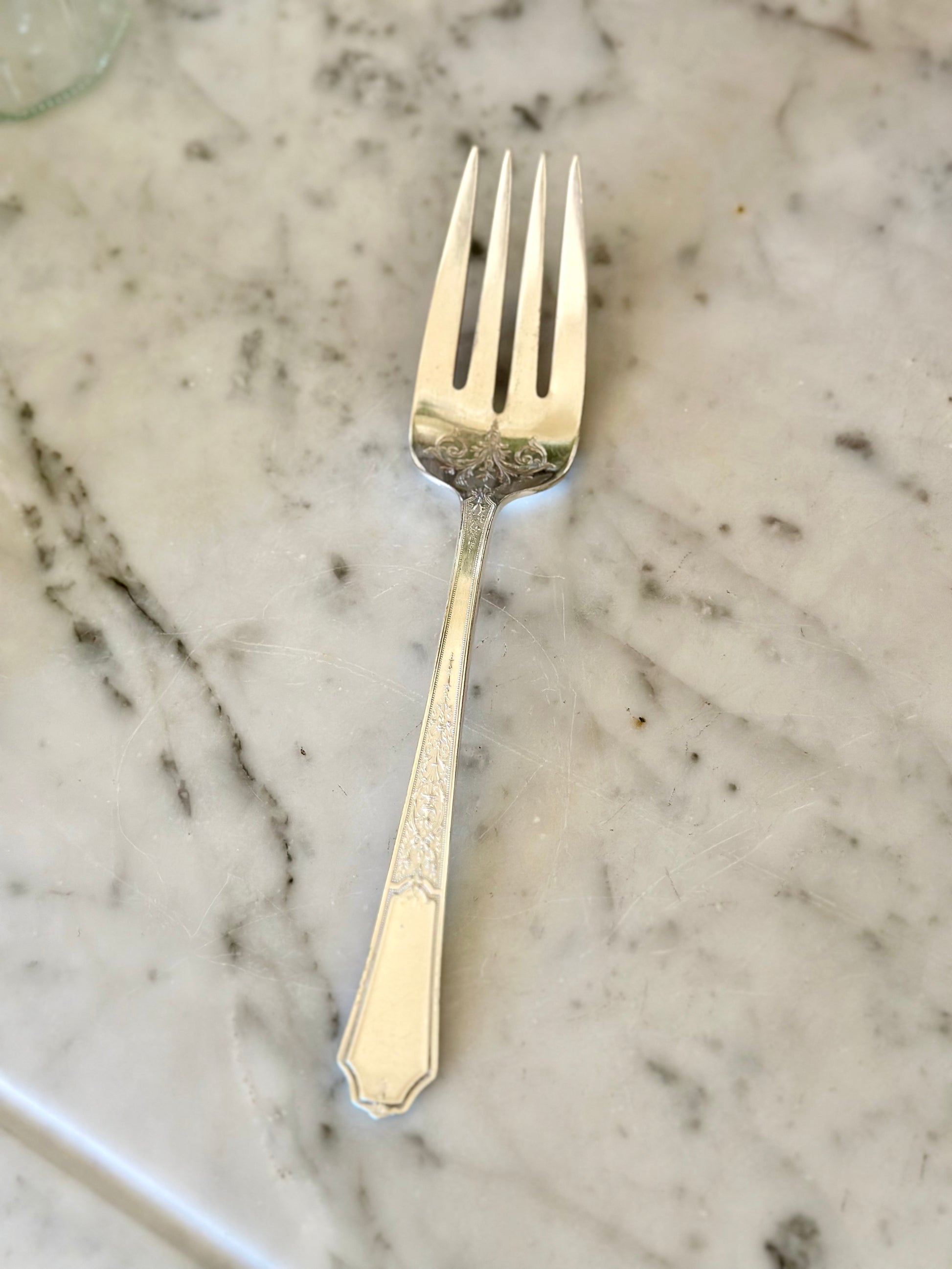Large serving fork with scroll pattern: Rogers Brothers; 8.25” L