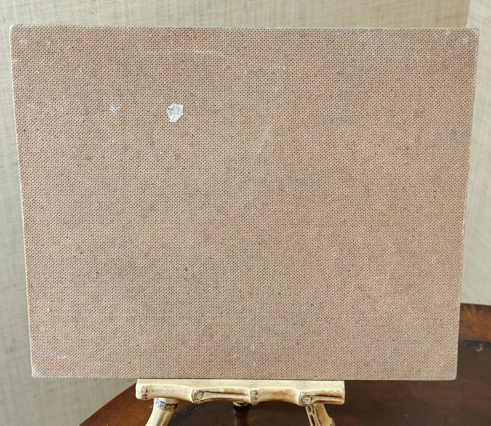 With no artist’s signature or notes on the scene depicted, we can use our imagination as to what village roofline we’re looking at here. I only know I was immediately drawn into the rich, golden-hour hues and geometric forms. A simple yet layered scene, it will look beautiful in a gold leaf or dark wood frame.