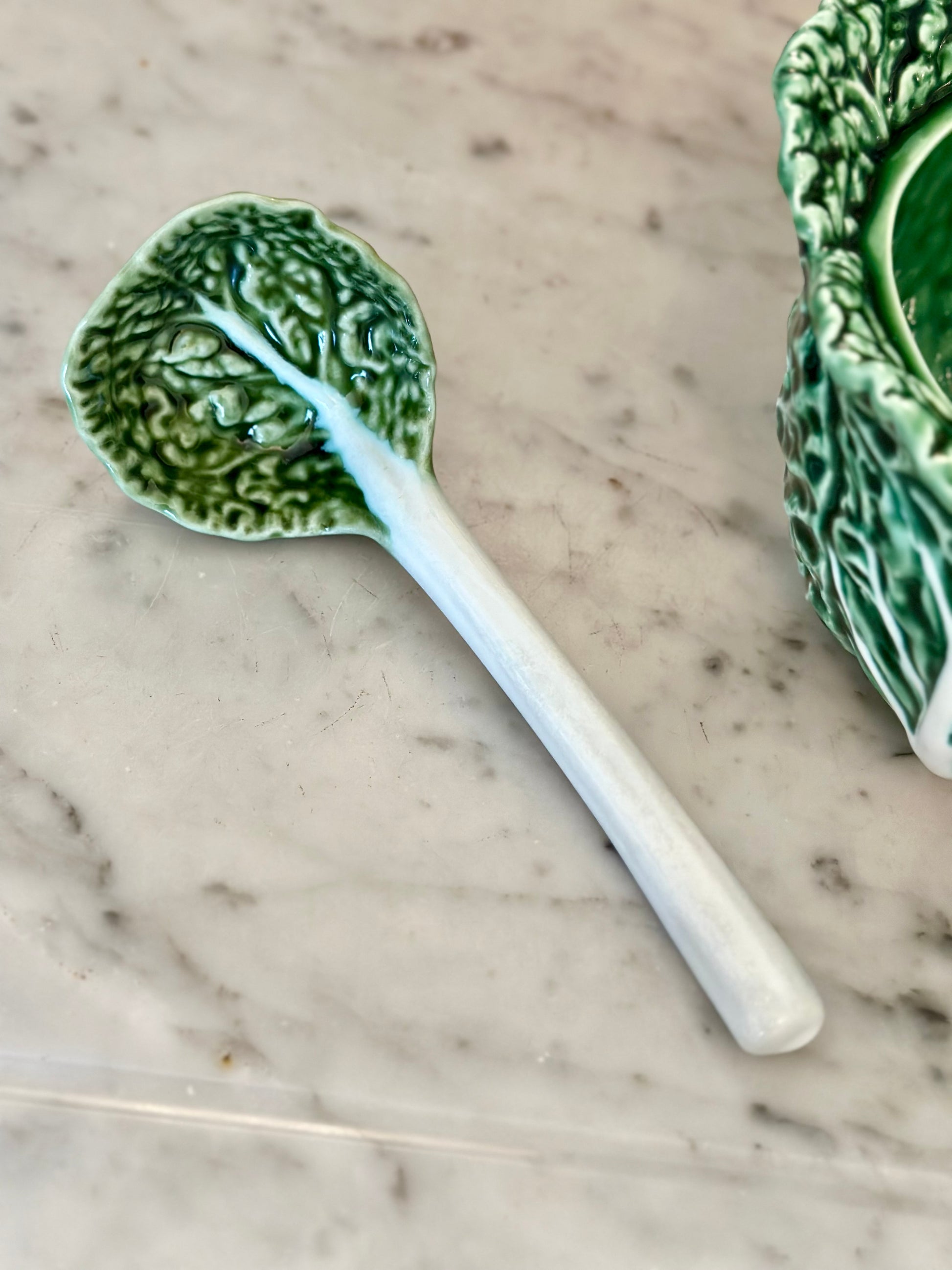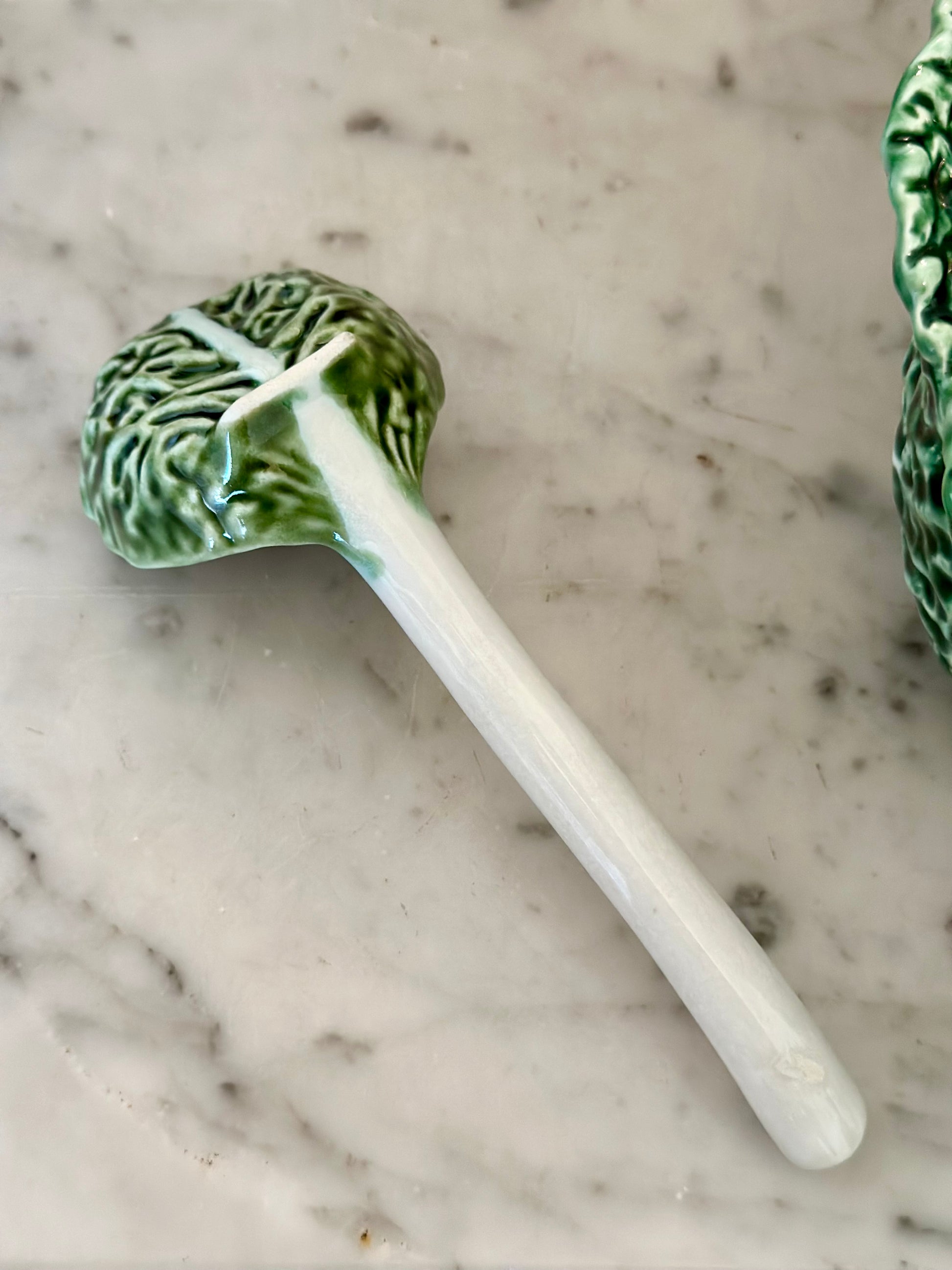 My guess is this is a vintage Bordallo Pinheiro piece since the logo is stamped instead of printed on the bottom. Three pieces included - bowl, lid, and ladle.