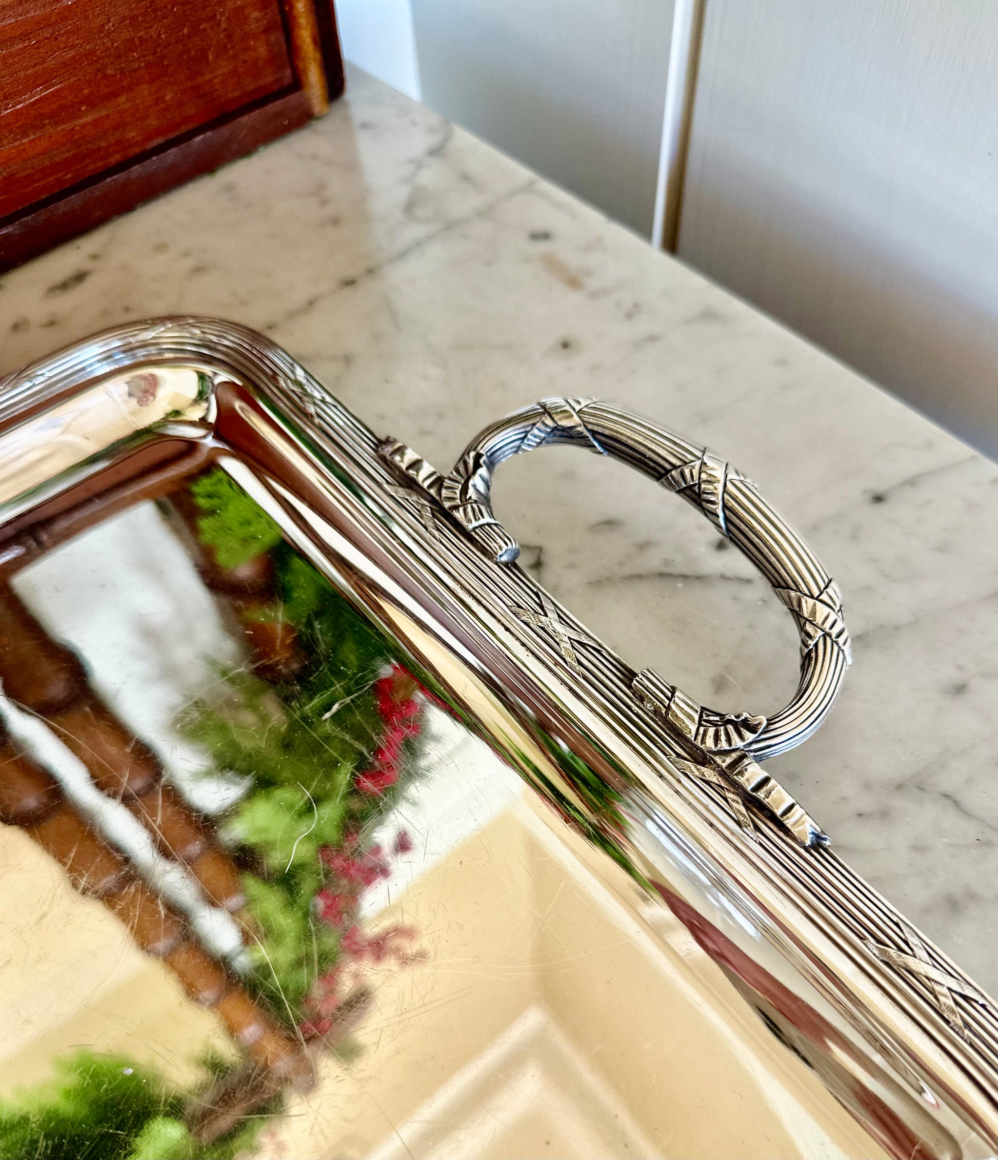 You guys this tray!! Rubans is one of Christofle’s silverplated product lines and today only the flatware is produced in this pattern. This tray was likely made at some point in the first half of the 20th century and some pieces currently listed online date as early as the 1920s. It’s a simple, timeless, heirloom quality piece by one of the world’s most renowned silversmiths.