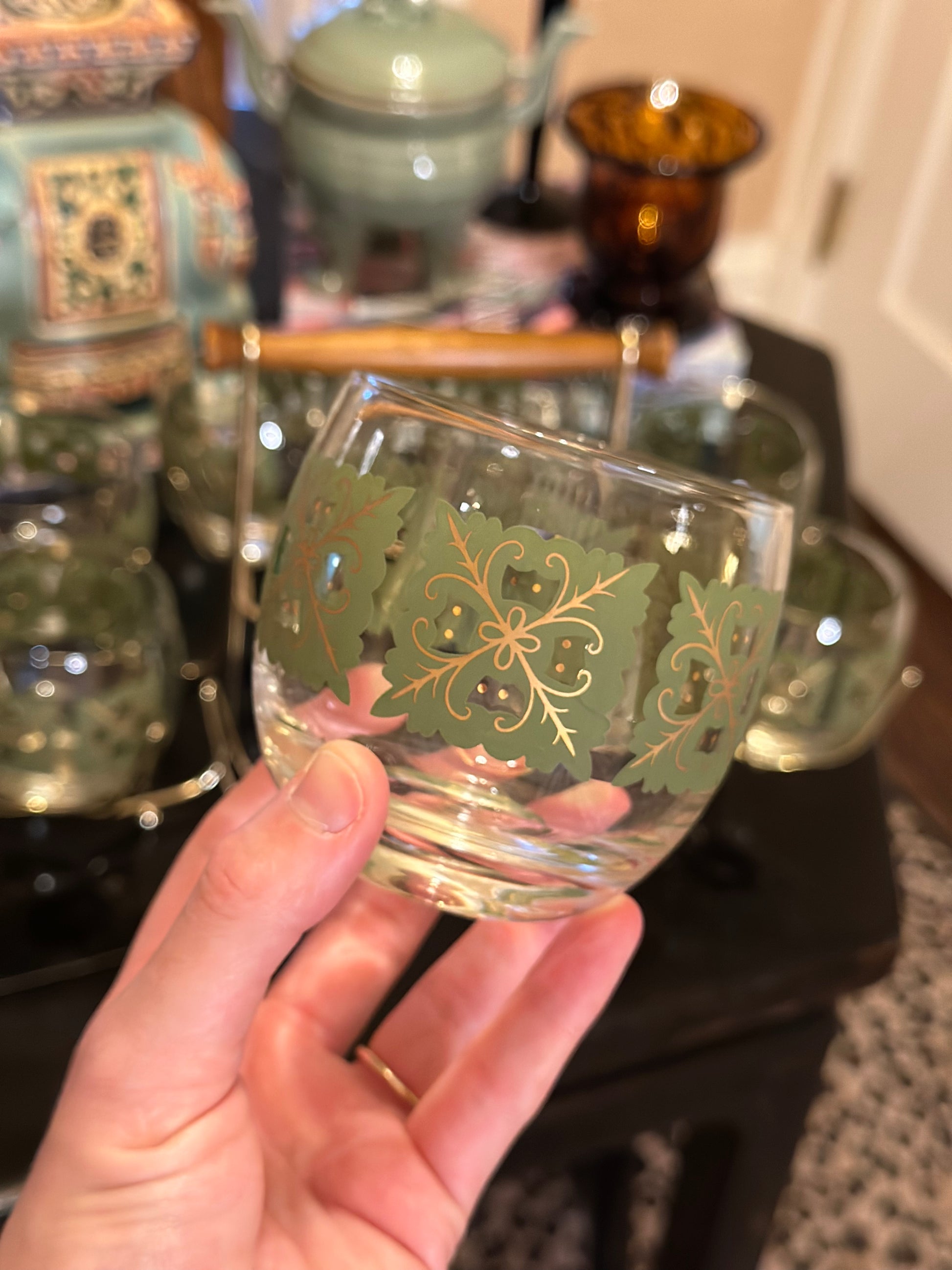 Vintage Midcentury Roly Poly Glasses with Brass Caddy