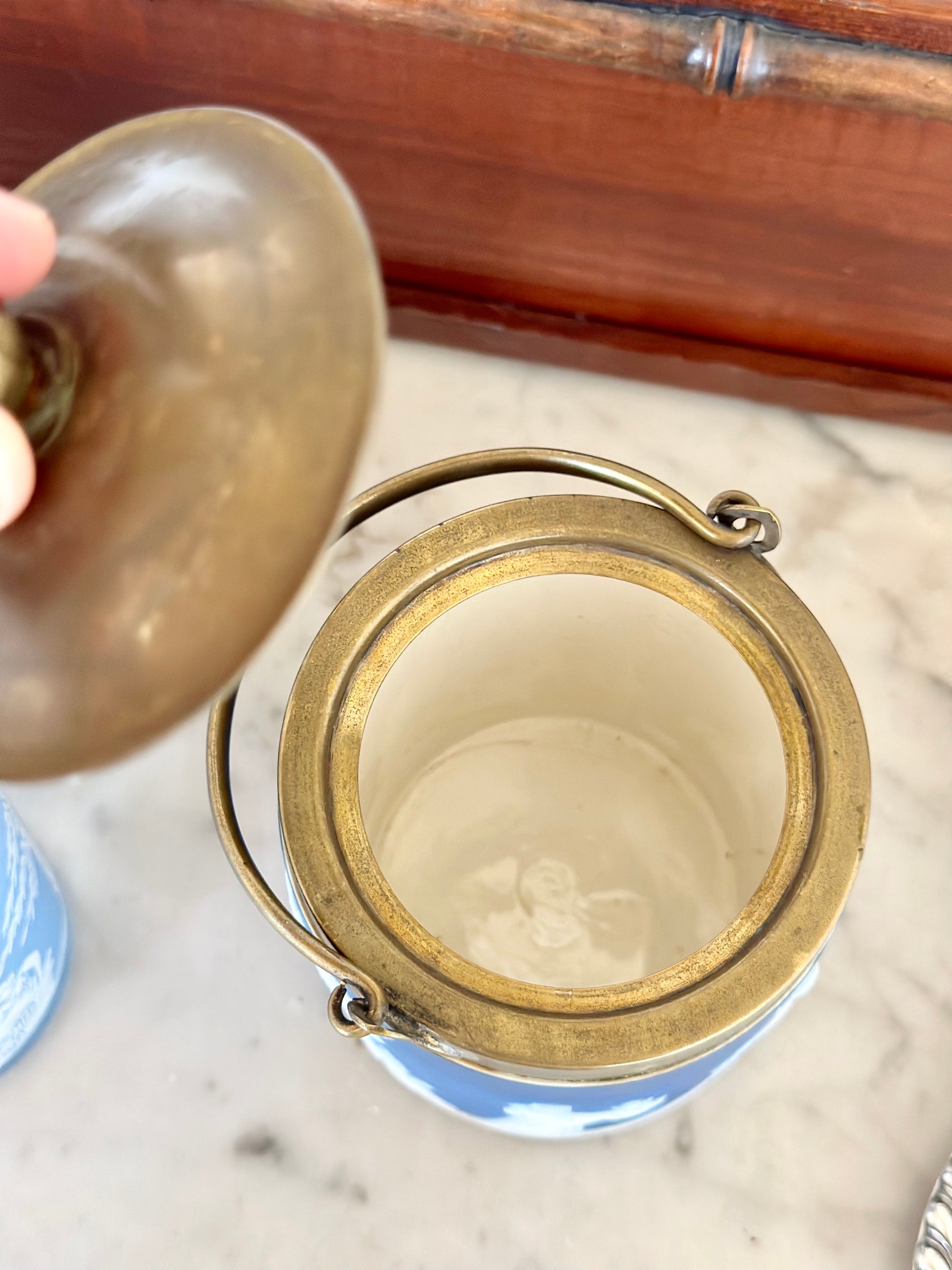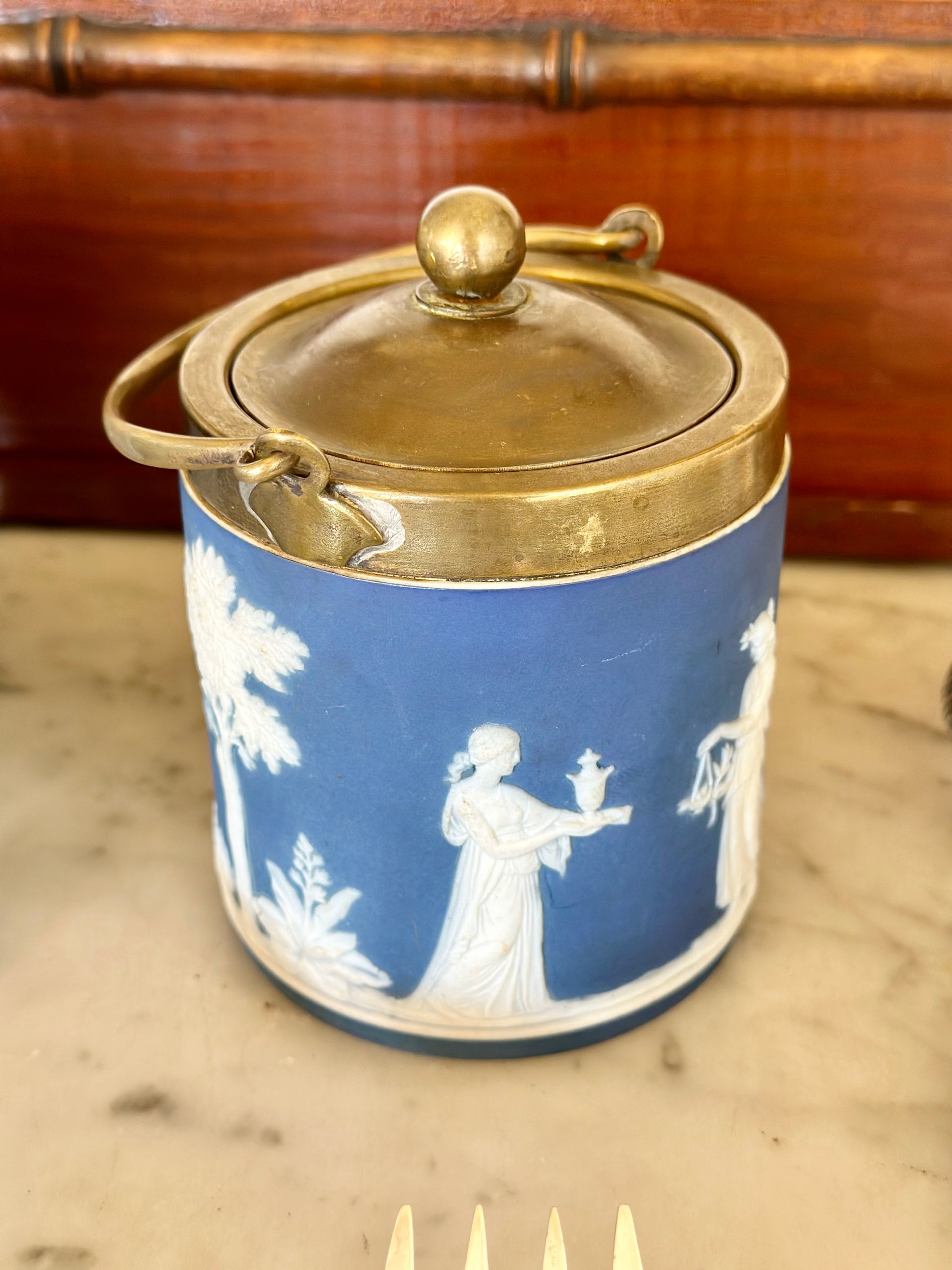 This tea tin is a mini version of the Wedgwood biscuit barrels that are so sought after. I love the darker blue color and my guess is it is an antique from the late 19th or early 20th century. No stamp on the bottom but at first glance I would have sworn it was Wedgwood! I would use this to store loose tea leaves, for flowers, or for sugar in a coffee station for guests.