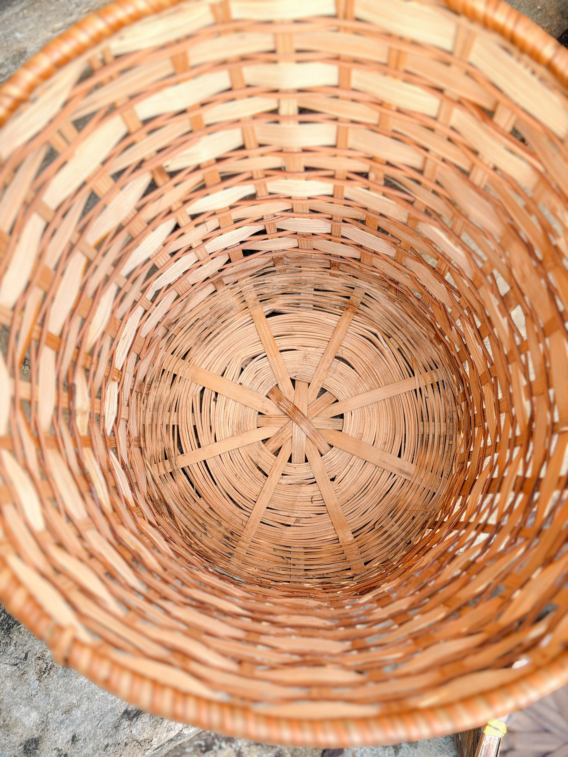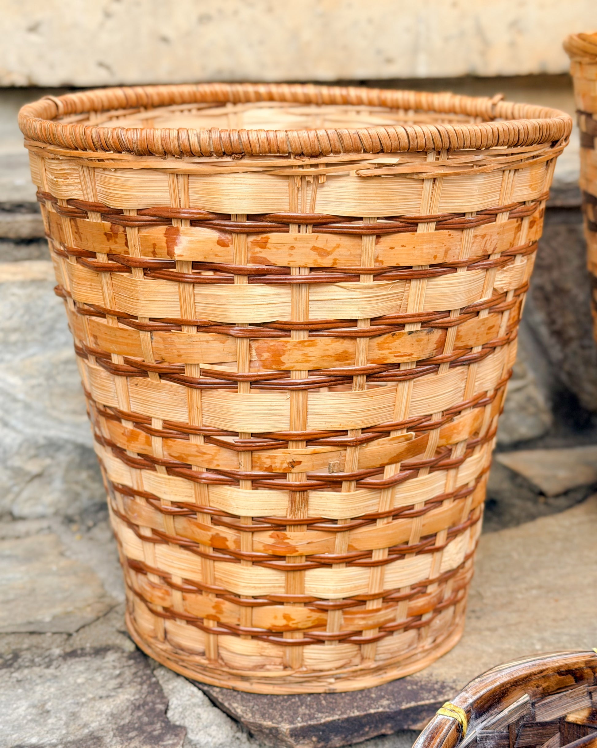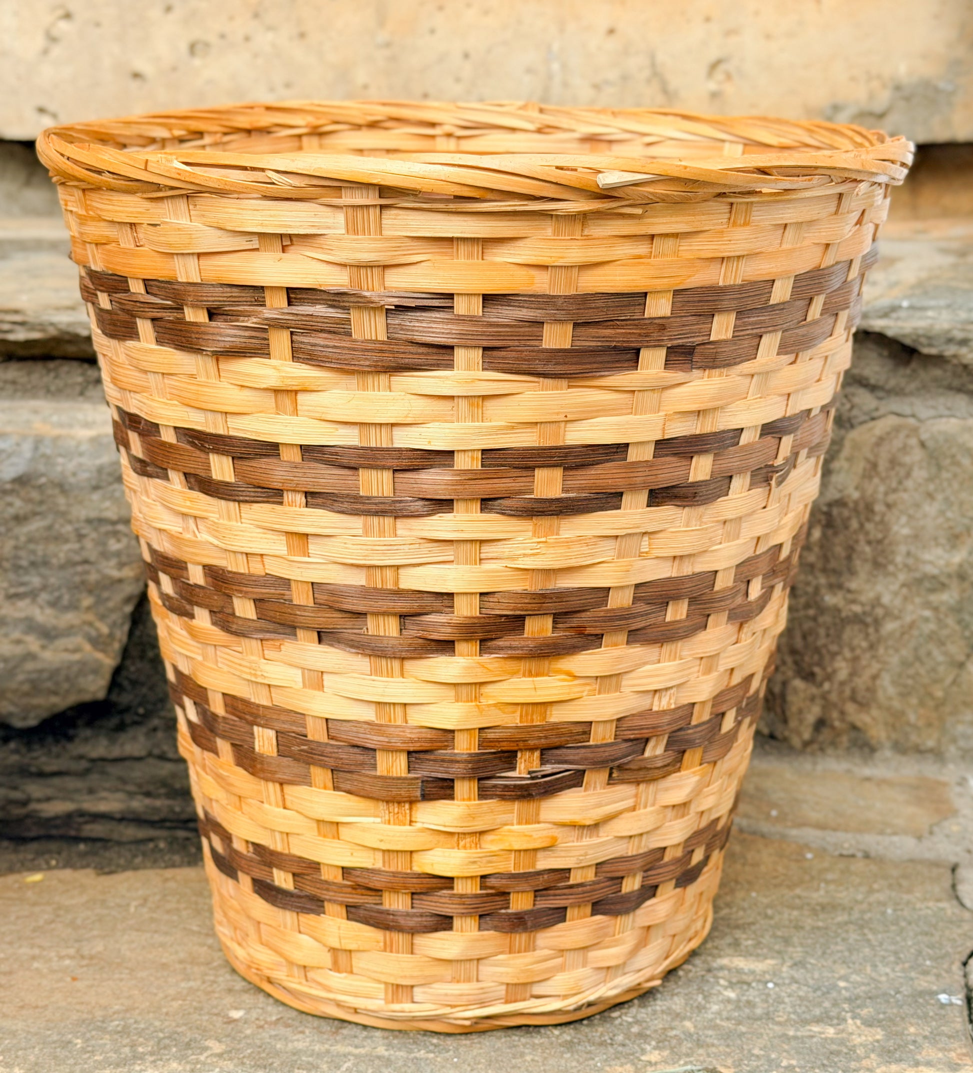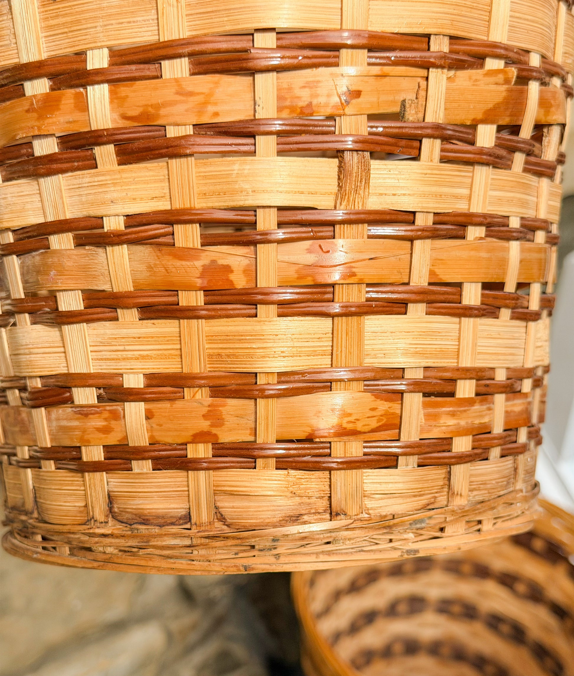 Medium Natural with Tortoise Stripe: Some evidence of moisture exposure along bottom of basket as pictured. Areas where wicker border along top of basket has split.