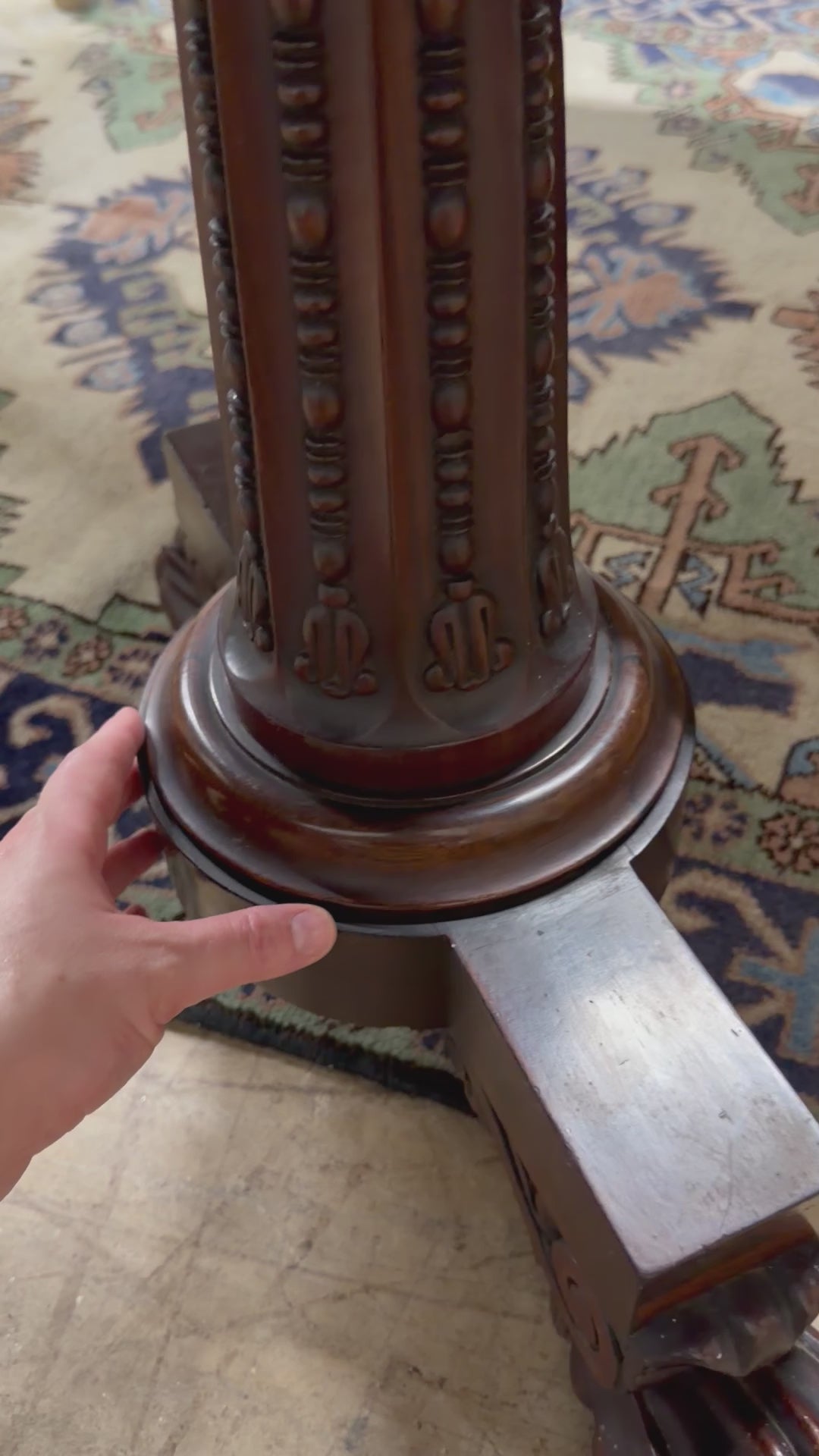 - On left leg, decorative ring between foot and leg is loose (video included). No impact to table’s stability.